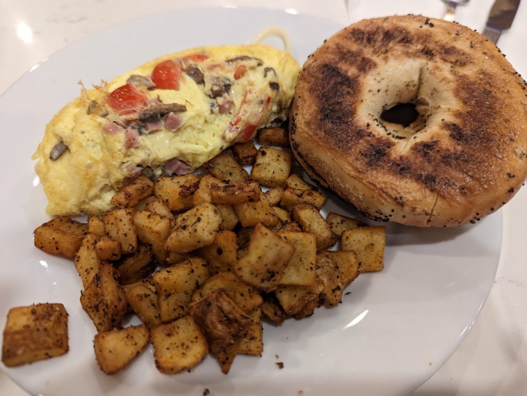 でも野菜に関して言うと、よくよく見るとオムレツに混ぜてもらうものとして、ほうれん草・マッシュルーム・トマトなどがあって、それで野菜が取れないわけじゃ無い。トースターで焼いたベーグルも美味しいので、まぁ、悪くは無い。しかし、オムレツにはチーズがたっぷり、ポテトもディープフライドポテトってわけで、ホントこんなのばかり食べてたら太るわ。