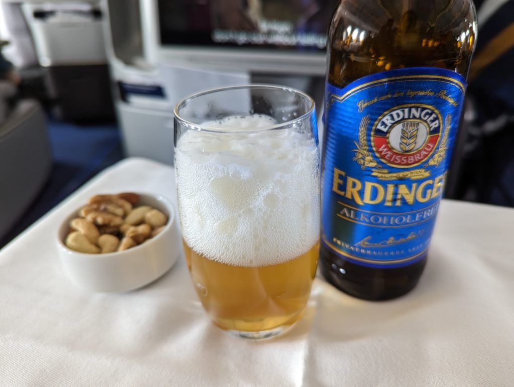 フライト中に飲むと、アルコールが一気に回ってしまうので、ノンアルコールビール。さすがドイツの航空会社、ERDINGER のノンアルが飲める。好き嫌いがありそうな味だけど、個人的に日本のノンアルコールビールより好き。