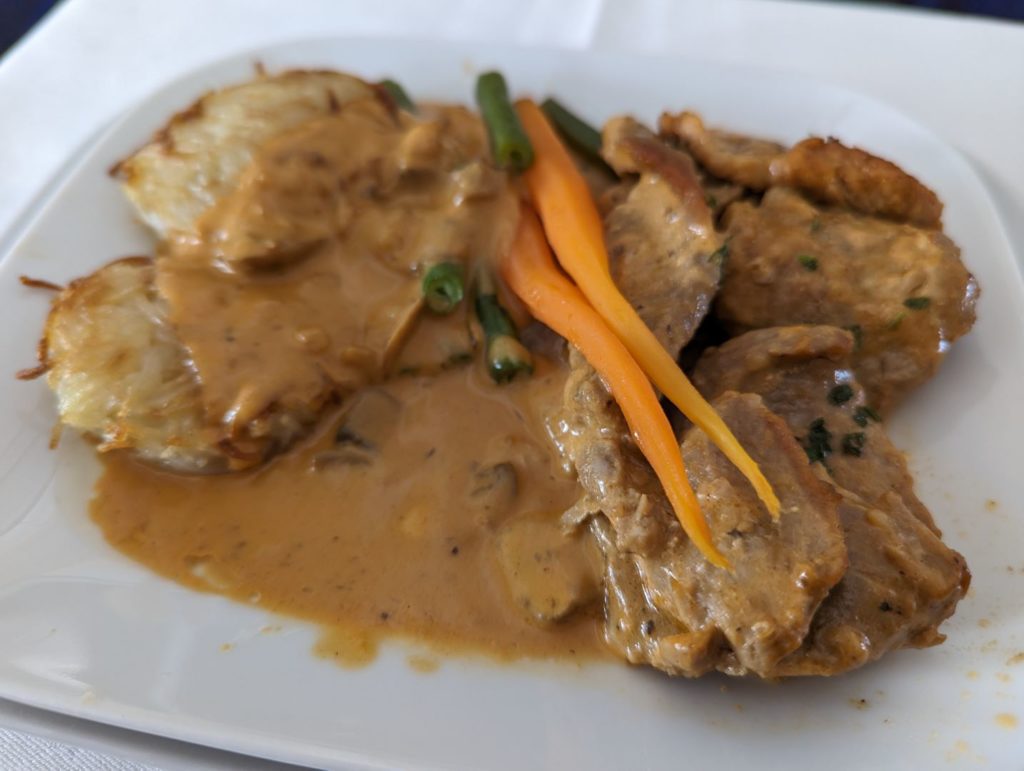 グレービーソースのようなソースを絡めていただくお肉とポテトの揚げ物らしきもの、美味しかった。細長い人参もなんかヨーロッパぽくって懐かしい。
