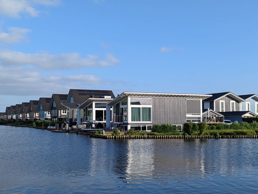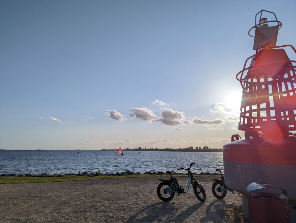 業務を終えたあと、湖の畔のレストランへの移動がてら eBike の試乗をしてみようって話になって、19時半頃からお出かけ。ヨーロッパのこの時期の日は長いので楽しめて良い。道中、この近くに以前住んでいたという同僚が色々と説明をしてくれる。写真の手前は水の上に浮く家、またこのあたりの多くの家はボートを持っているみたい。