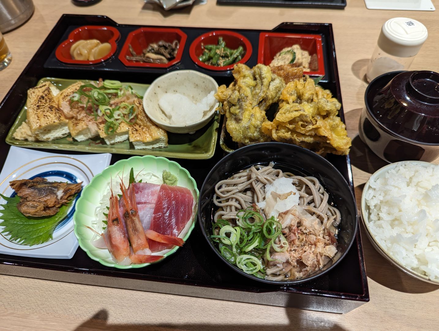 メニューの写真で見ていたとはいえ、写真よりも全然ボリューミーでびっくり。写真の手前左から、へしこ、お刺身、おろしそば、竹田の厚揚げ、舞茸の天ぷら、ソースカツ(舞茸に隠れちゃってる)、大根の煮物(たくあんみたいな見た目だけど)、ゼンマイの煮物、いんげんの胡麻和え、湯葉?(豆腐みたいな見た目だけど、豆腐でもないし多分湯葉でもない)ときゅうりのわさび風味のもの。