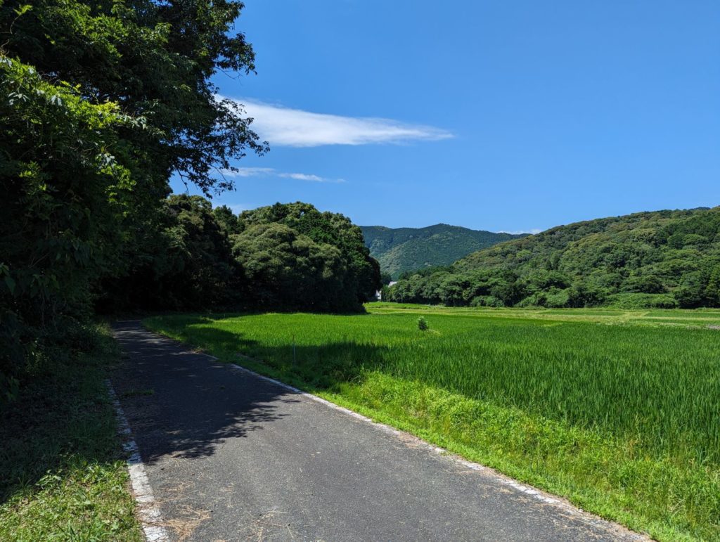 田んぼの緑と青空のコントラストが眩しくて、独特な草いきれを感じながら歩くのも悪くなく、登山道から外れてこういうところを歩くのなんだかいいなぁという感じで駐車場へ。