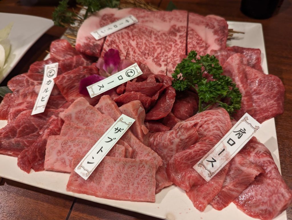 そして、お別れの夜の食事は焼肉。実は、彼らと一緒にいた福岡でもそうだったのだけど、グルテンフリーである必要があって、食事は本当に大変でした。小麦粉がダメなのでと伝えるだけではダメで、意外と小麦粉を使ってしまっている食品って多くって、その典型が醤油。和食って醤油を使って味をつけるものが多いので、それが全て NG というのがかなり厳しい。だから、滞在中何度かは本当にほとんどの食事に口をつけられず、持参していたバナナやナッツバーでということを見て、申し訳ないなぁという気持ちでいっぱいに。とはいえ、それはしょうがないしわかっていて、だから食べられるものをちゃんと自分たちで準備するんだよと。
