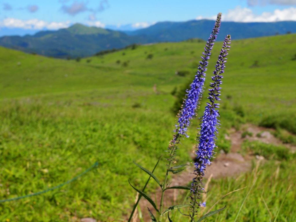 車山乗越から蝶々深山へは草原の中の一本道を進んでいく。所々に高原植物の花々が咲いている。涼しいと思ってたけど、影が全然ないので日差しの強さがちょっと堪えるな。