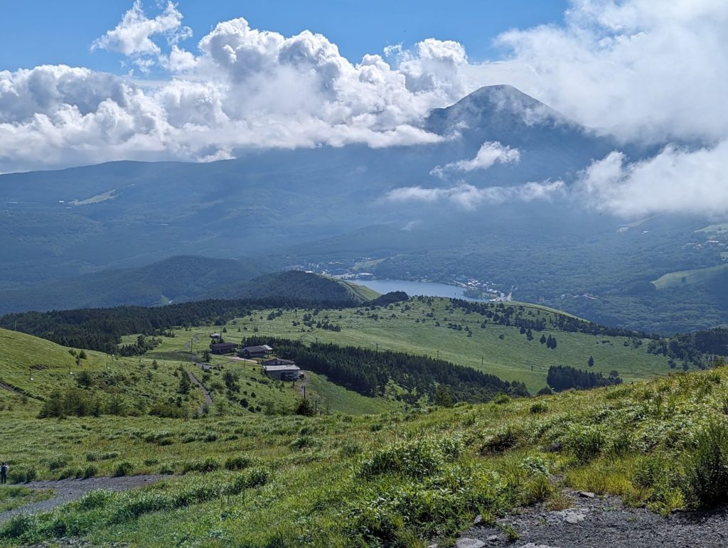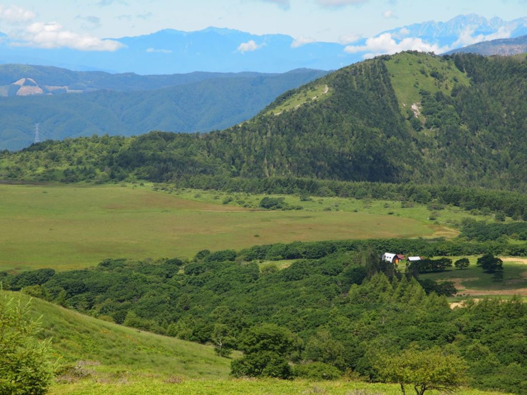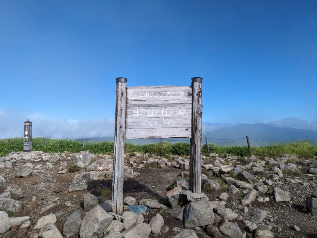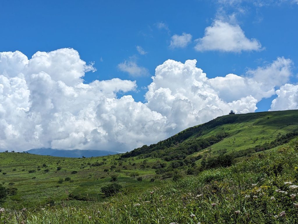 なだらかな上りを緑を楽しみながら 30分ほど歩くと、白い球体が乗った気象観測用と思われる建物が見えてきて、あっという間に車山の山頂に到着。登山しましたって感じはないけど、それでも 2000メートルに近い山頂からは 360度広がるパノラマを楽しめて良い感じ。