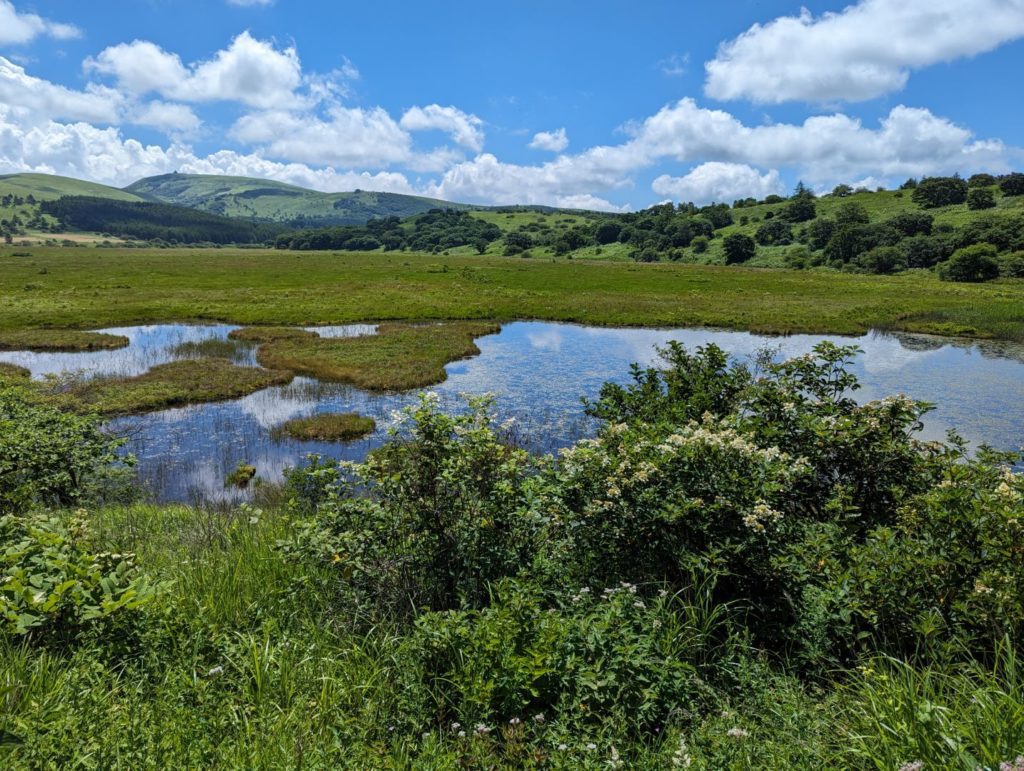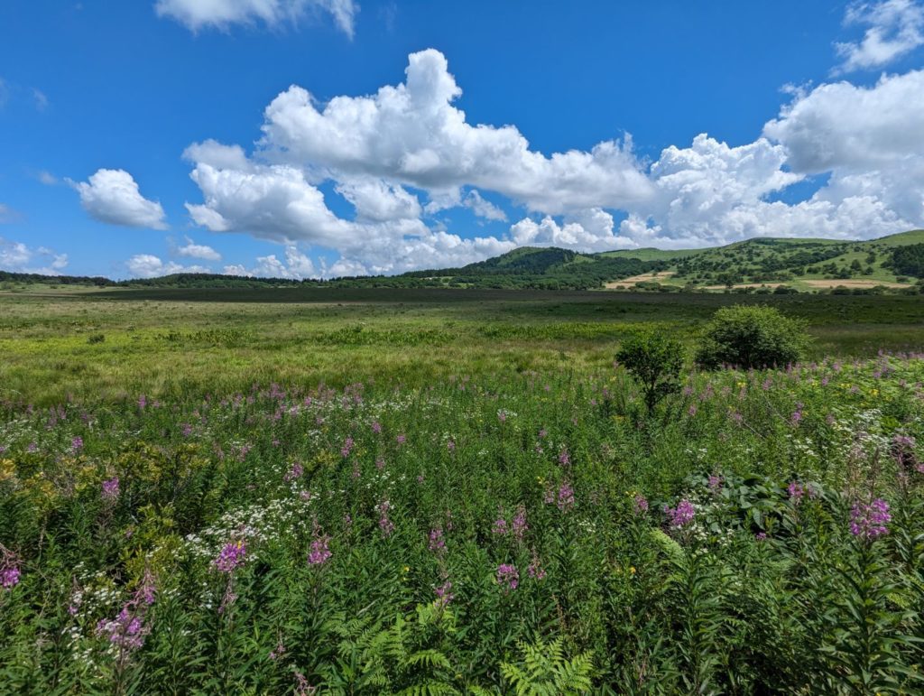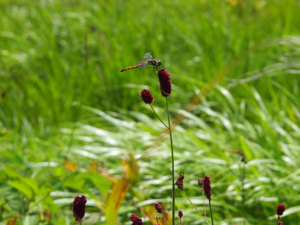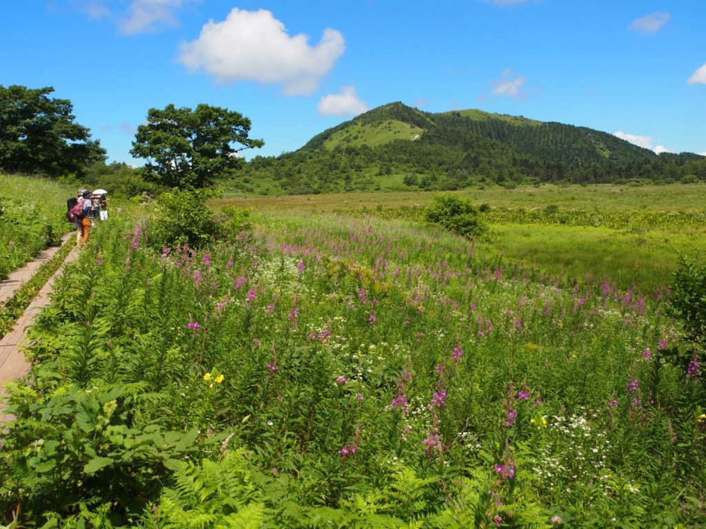 湿原には白・ピンク・黄色・紫の花々が咲き乱れていて、草原の緑、青空、白い雲を背景に本当にとても綺麗だった。それに、所々でアサギマダラが花にとまっていたりするので、思わず足をとめてしまうわけです。