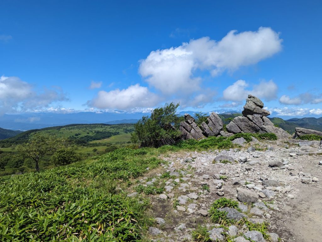 八島湿原の入り口に向けては、蝶々深山からのんびり歩いて1時間弱。草原ばかりの中で、ちょっと変わった岩があるのが物見岩。