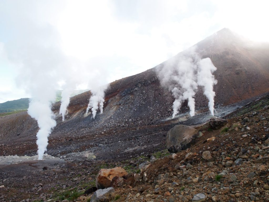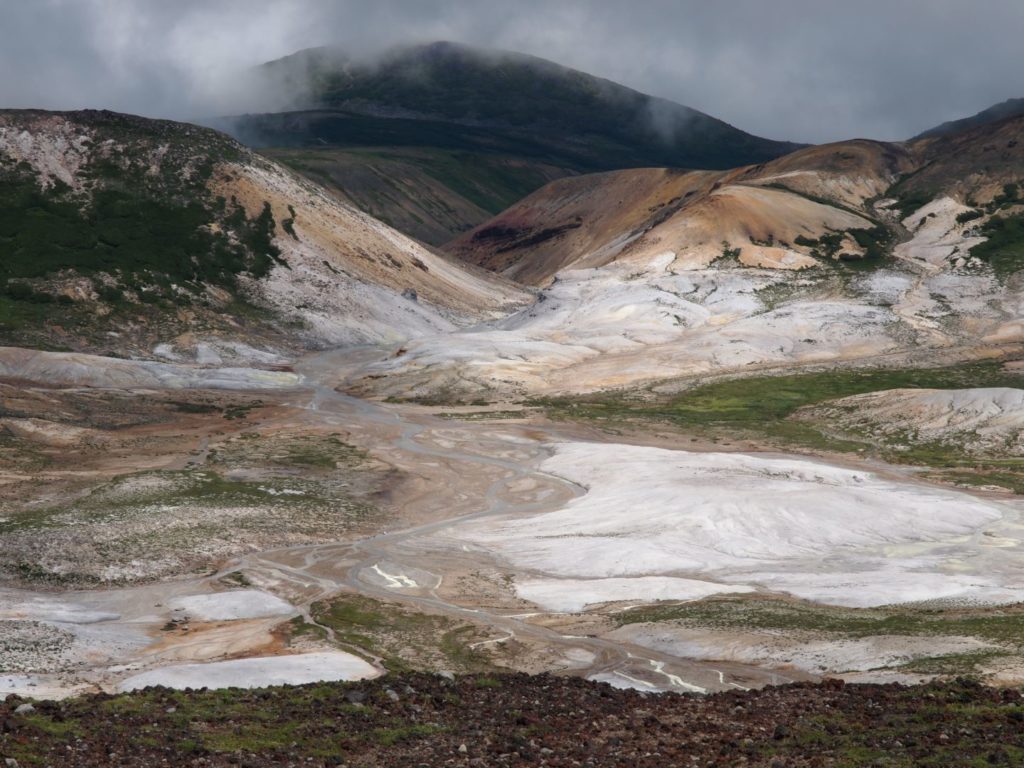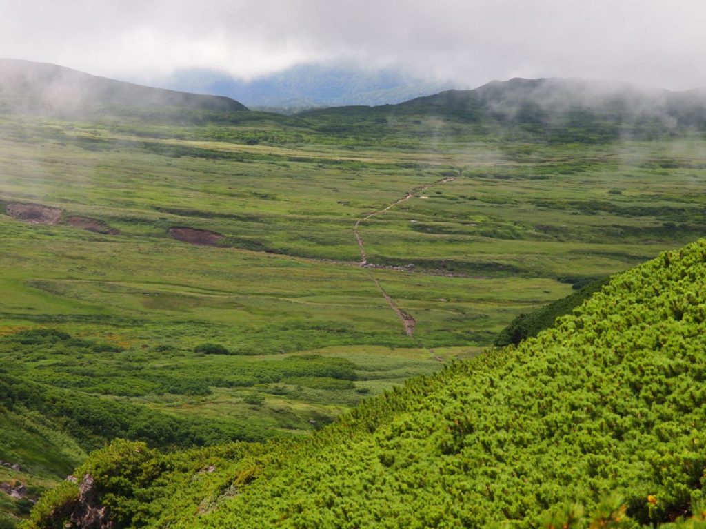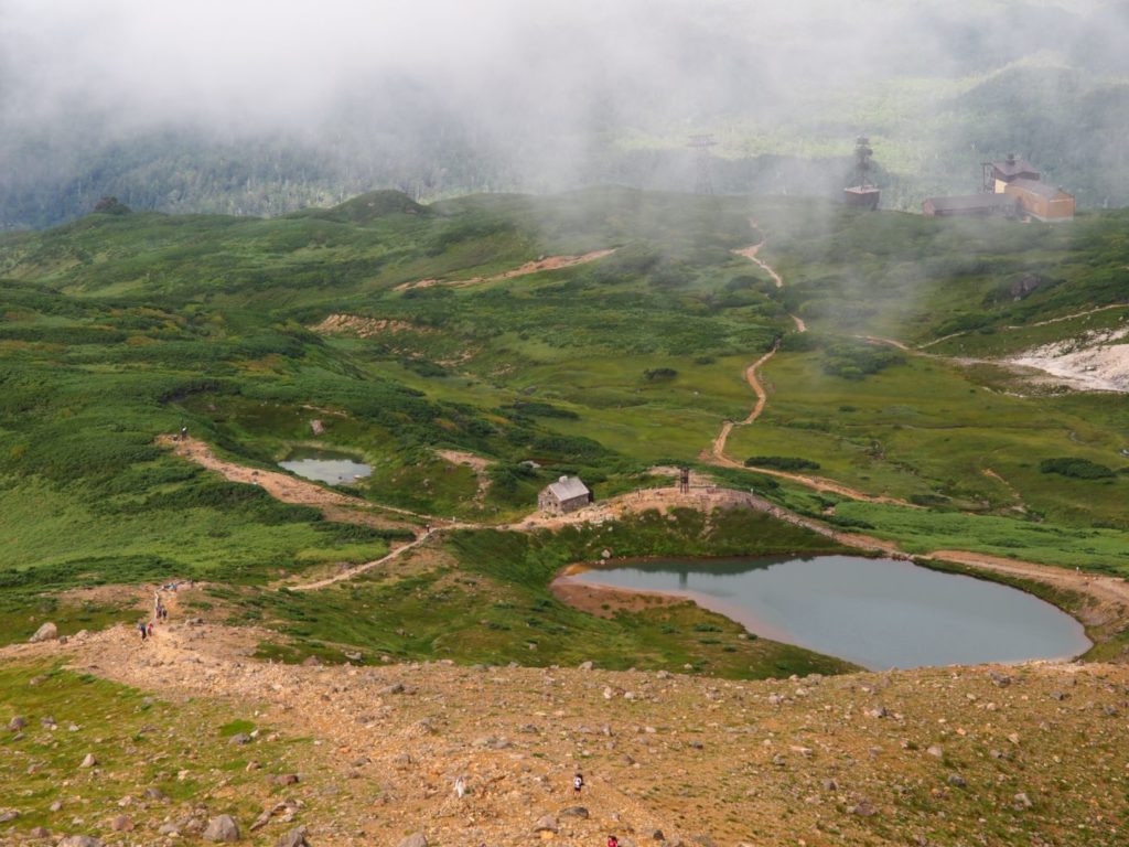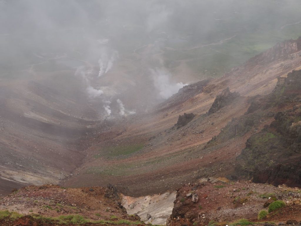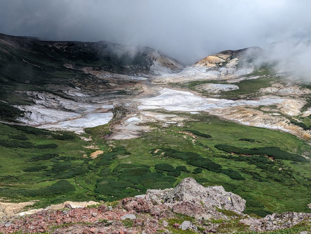 間宮岳からしばらく進むと、右手に巨大なカルデラが見えてくる。今回子供に見せてあげたかった景色の一つがこの御鉢平。今も有毒ガスが噴出しているので立ち入りが禁止されているのですが、地図上にはこの御鉢平の真ん中に「有毒温泉」という温泉マークがあって、めちゃくちゃ気になってます(笑)