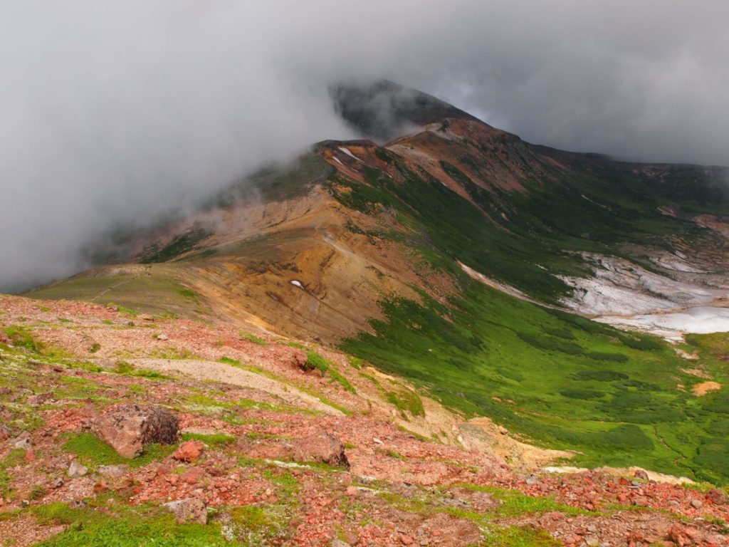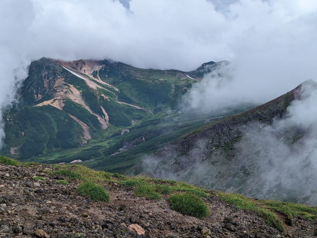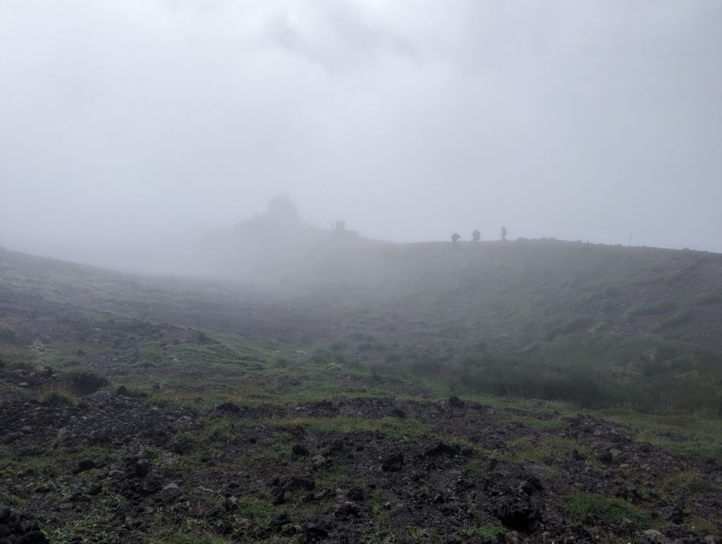 頂上には多くの人がすでに到着していて、ガスが晴れるのを待っている感じ。すると「おー見えてきた!」という声が。ガスは本当にさーっとあっという間に引いて、目の前に濃い緑の山々が。本当に一瞬なんだけど、こういう景色が時々見えるようになるから、なかなか頂上から離れられない。