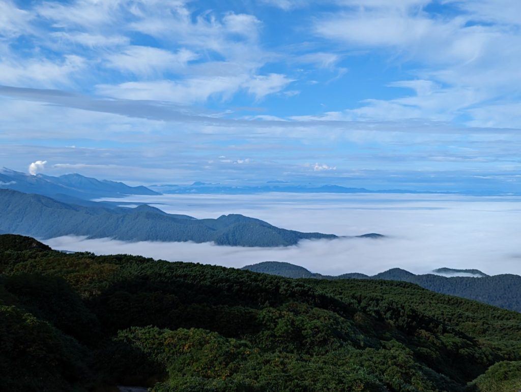 天気予報が数日前からコロコロ変わる感じで微妙だったし、麓の東川町から中腹まで上がってくるまでも曇り…どうかなと思っていたけど、ロープウェイで姿見の駅に上がってくると見事な雲海が広がっていて、しっかりと晴れ間が。