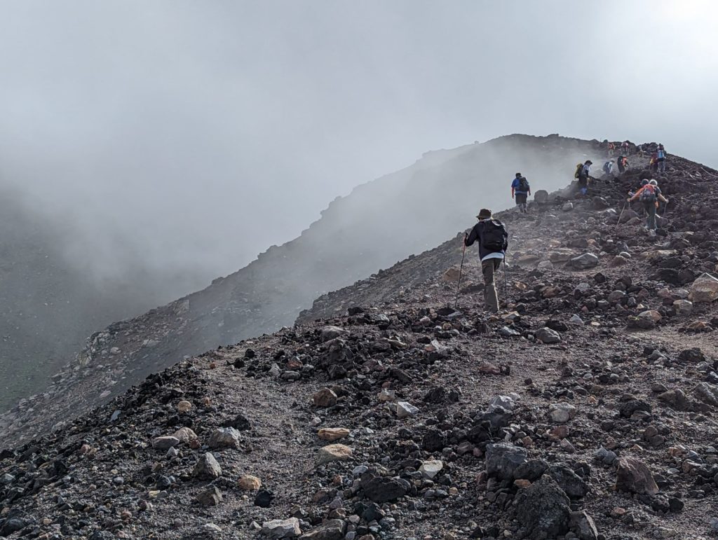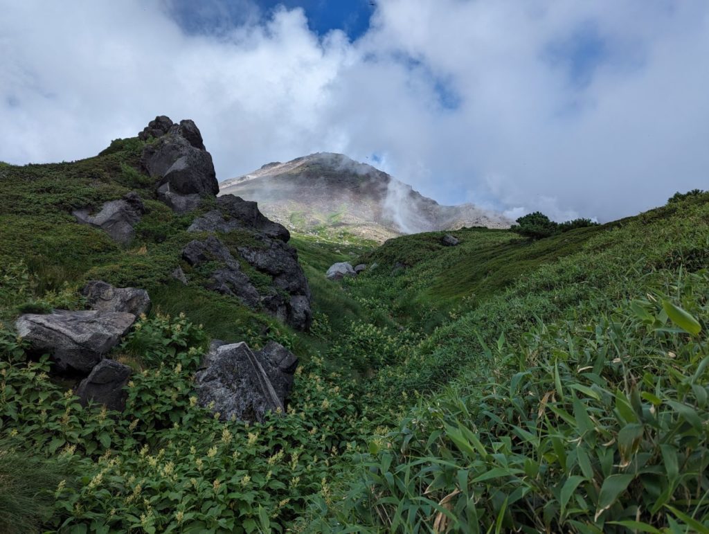 そして、ついに見覚えのある姿見周遊のコースが見えて、ようやくゴールは目前。この時間帯は写真の通り雲がかかって山頂が見えなくなっていたので、早朝に綺麗に晴れて山頂を見ることができていたのはやはりついていたのかも。休憩時間も含めて、ほぼほぼコースタイムどおりに戻って来れたので、子供の成長ぶりには驚かされました。