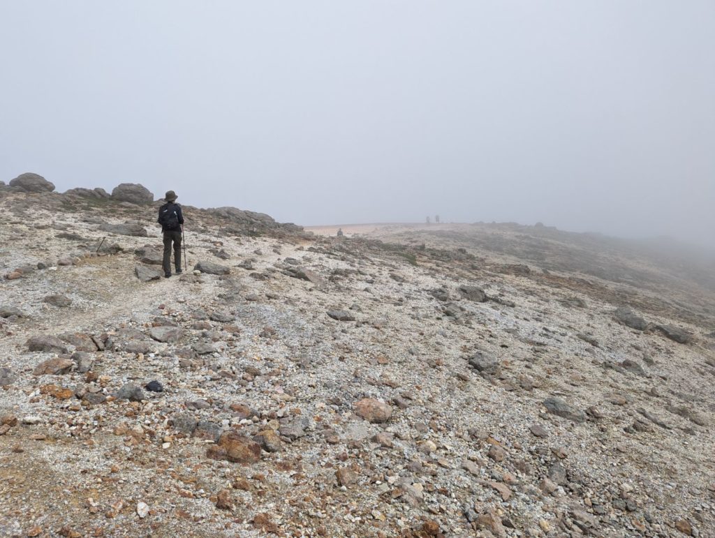 そこからしばらく歩くと、景色が一変して一面白い世界へ。自分が以前ここに来たときは、濃霧のようにガスがかかっていて、道に迷いそうになったエリア。晴れていればなんの問題も無いのだけど、意外と道標になる印が少ないので、気をつけないと行けないわけです。