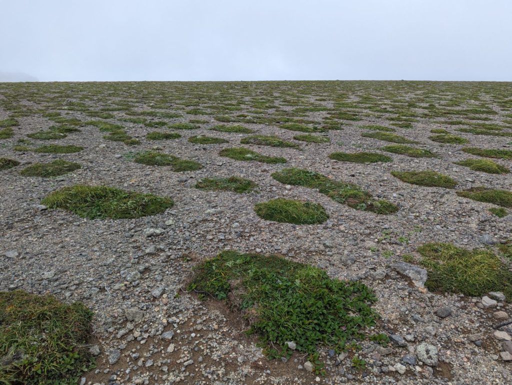 間宮岳山頂近辺はほぼ平坦で、さらにこの日は丸い島のような形で緑が点々とする模様が作られていて、実に不思議な雰囲気。