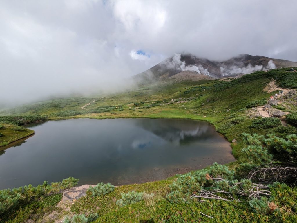 朝早い時間で風も穏やかで、姿見の池に旭岳が映り込む見事な景色が。この景色は何度見ても思わずはっとさせられる景色。