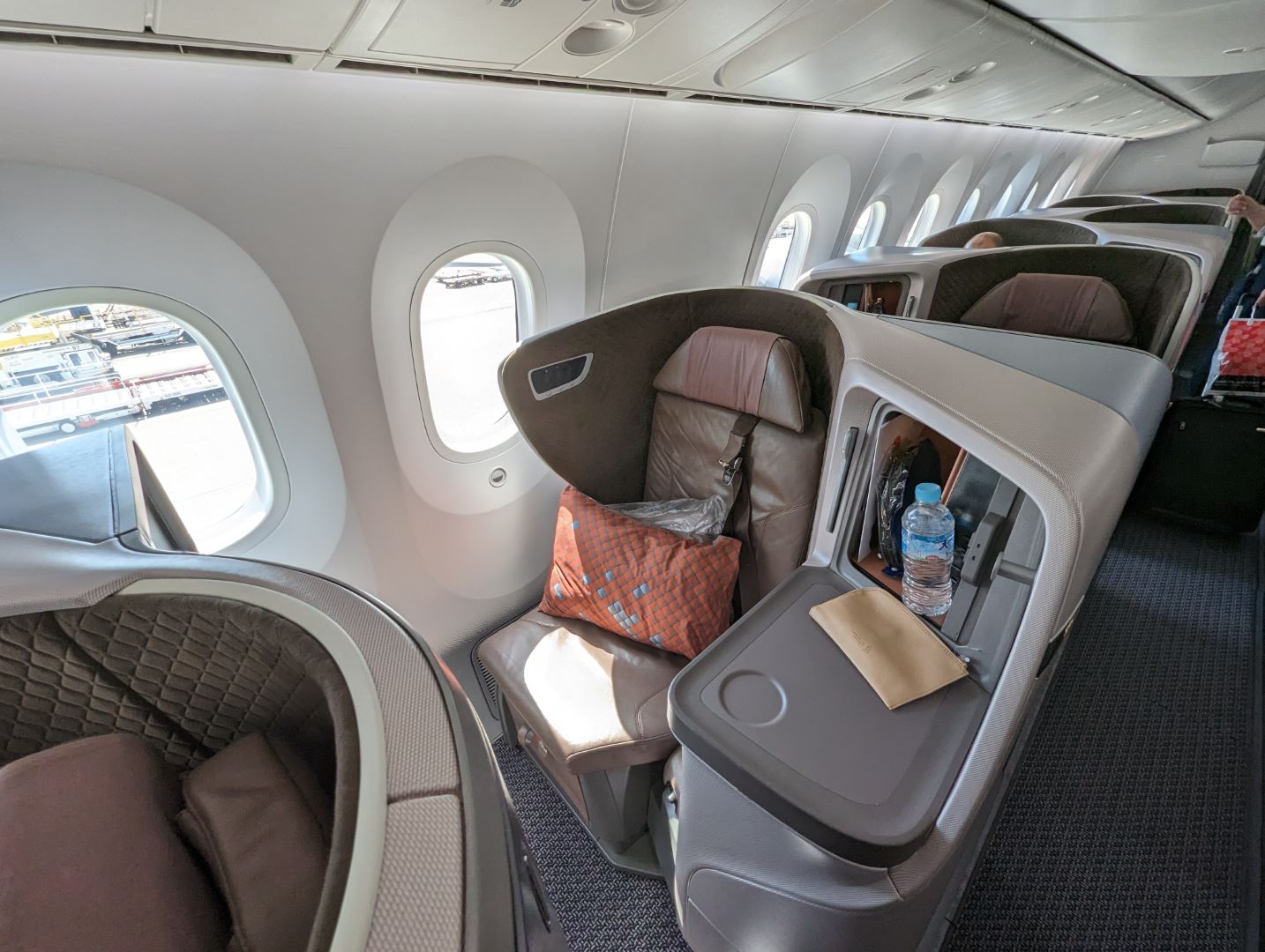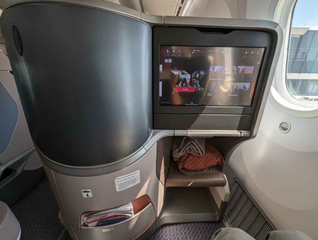 フルフラットになる座席自体には何ら問題なく、大きな画面のエンターテインメントシステムも、充実したコンテンツとともに良い感じなのですが、1枚目の写真の通り座席を囲むようなカバーのような出っ張りのせいで窓際の席を選んでも外が見えにくいのはちょっと頂けない…ちょうど顔を横に向けるとスイッチの類があるのだけど、この位置になくても良いので、このカバーらしきものを外すか、可動式にしてほしいところ。