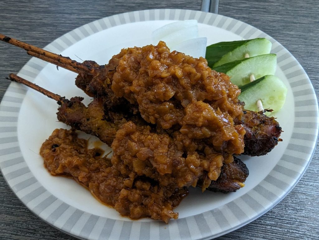 離陸後しばらくして供されるのがシンガポール名物のサテー。串焼き肉にナッツの食感と独特の甘さがあるソースをたっぷり付けて食べるのだけど、これは美味しかったな。付け合せの生の玉ねぎがめちゃくちゃ辛くて驚いたけど、ビールが欲しくなる一品。