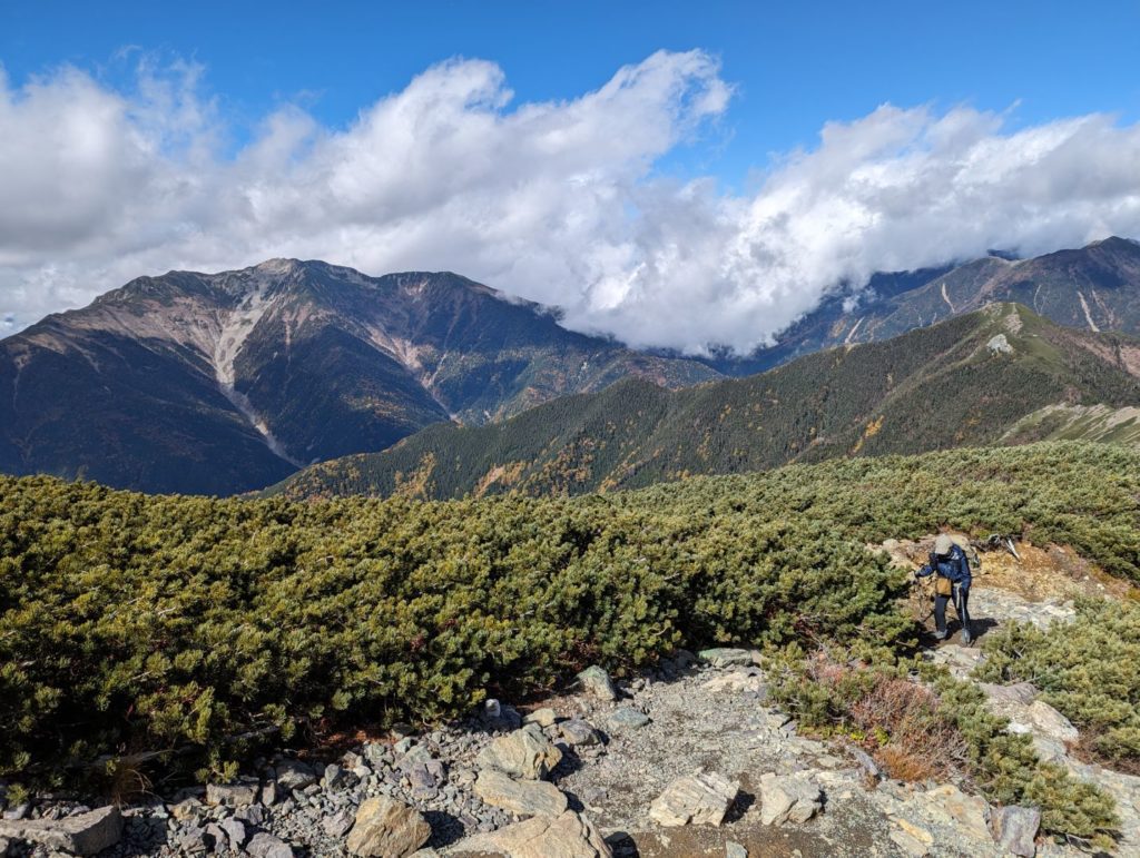 やっと稜線に!360度見回すと南アルプスの山々が広がり、これまでの急登の疲れが吹き飛ぶ。雪化粧した岩峰、紅葉の黄色、ハイマツなどの緑が錦のように美しく、この時期ならではの景色に思わず綺麗だなあと独り言が出てしまう。