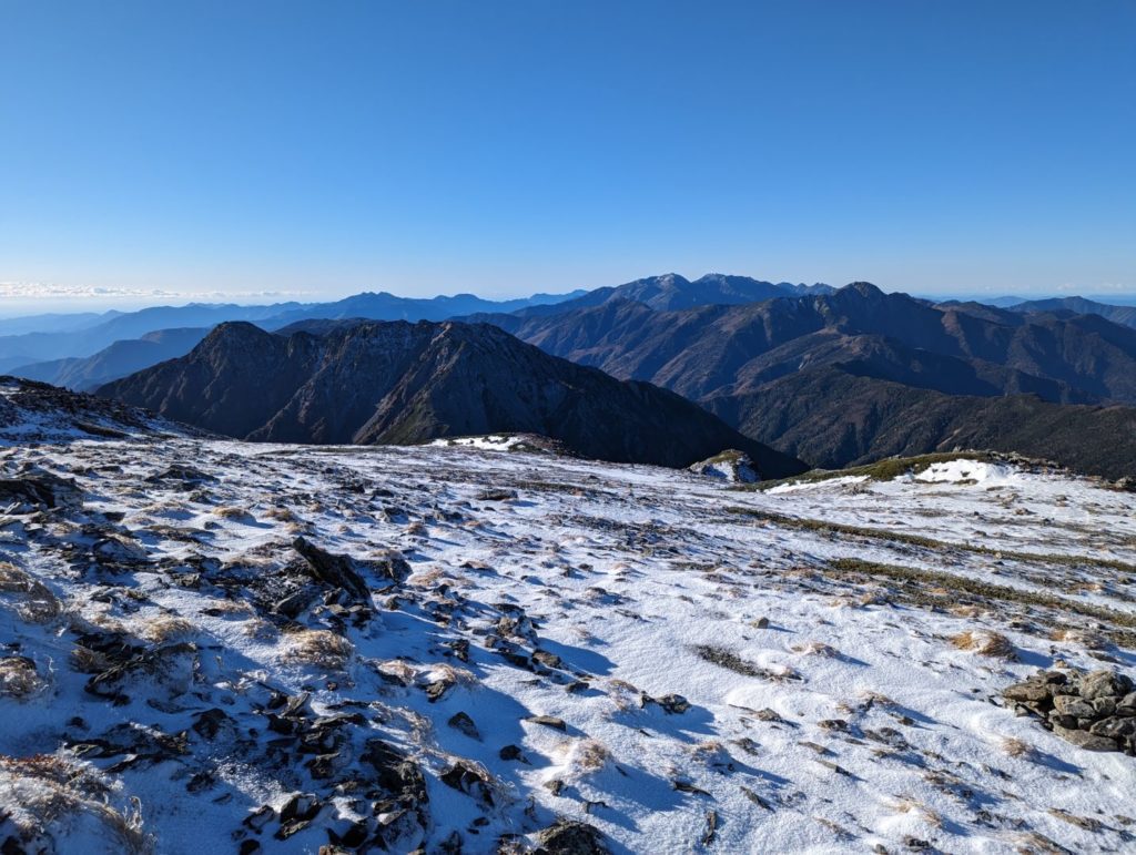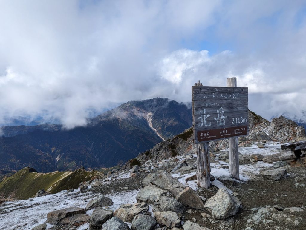 岩場に薄っすらと雪が積もっている状況を12本爪のアイゼンでとなったので、だいぶ気を使う登りではあったけど、なんとか北岳山頂に到着。いや…ここまで大変だとは思いもしなかったというのが正直なところ。