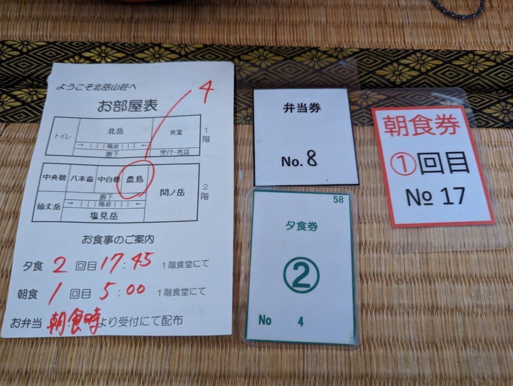 北岳山荘では、受付で予約していた名前を告げると、夕食は2回目の17:45分からで朝食は1回目の朝食で5:00から、部屋は2階の農鳥の部屋の4番ですと。翌日のお弁当も予約していたので、弁当券も頂いて部屋へ。