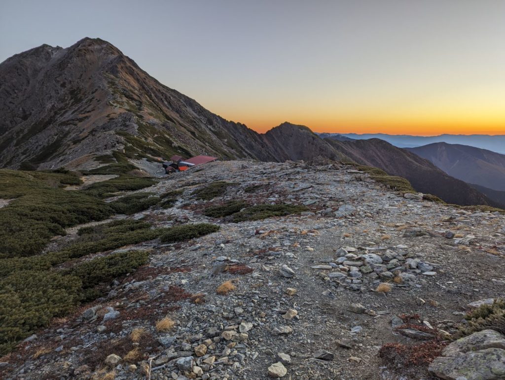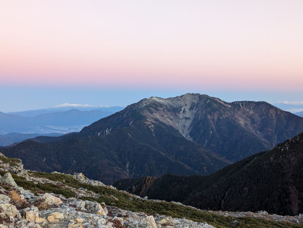 朝5:00 の朝食を終えて、外に出るとちょうど日の出の時間。北岳山荘の玄関裏側には目の前に朝焼けの空にくっきりとした富士山が。朝日を受けて赤く染まる姿が本当に綺麗。左に目を向けると美しい山容を見せる北岳がオレンジ色のグラデーションをした空に堂々とそびえていて、さらに西側に目を映すと、今度はピンク色の得も言われぬ色をした空に仙丈ヶ岳、さらに南側に目を向けるとモルゲンルートに染まる間ノ岳…贅沢な時間、まさに息を飲む絶景でした。