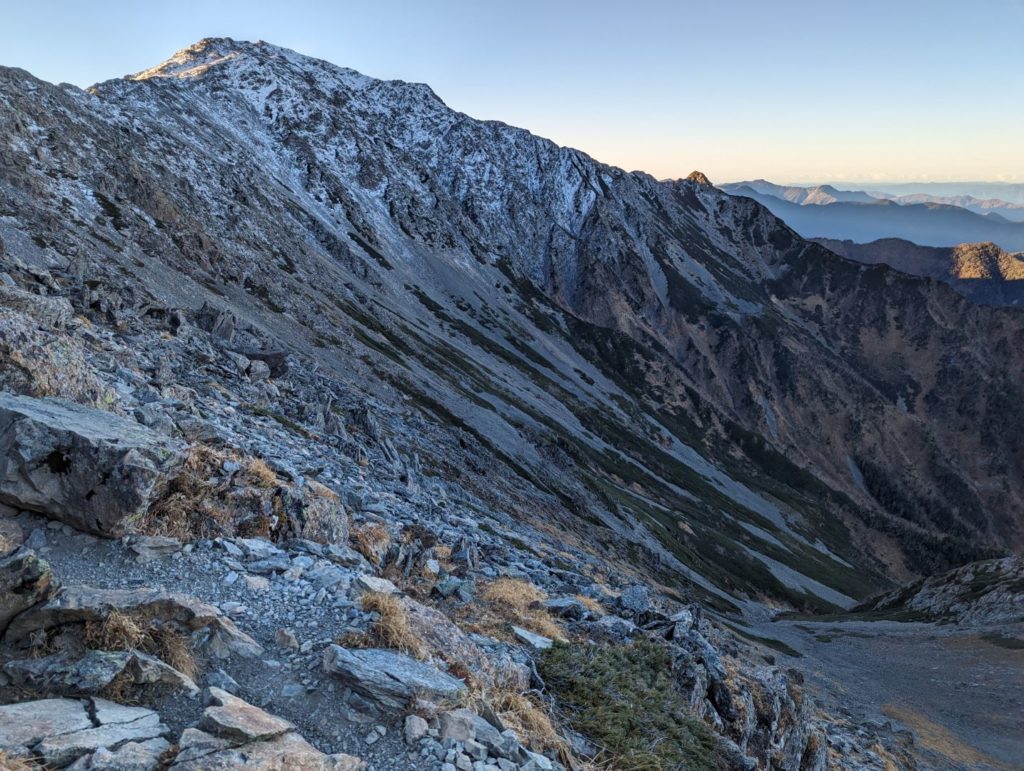 前日は疲れと天気の心配で、間ノ岳往復は諦めようかなと思っていたものの、天気にも恵まれて疲れも問題ないと感じられたので、北岳山頂で早朝の絶景を楽しんだ後、間ノ岳へ向かって出発。しばらくの登りの後振り返ると、北岳に隠れていた甲斐駒ヶ岳も見えてきた。仙丈ヶ岳・北岳には登ったので、近いうちに甲斐駒ヶ岳にも登ってみたいと改めて思う。
