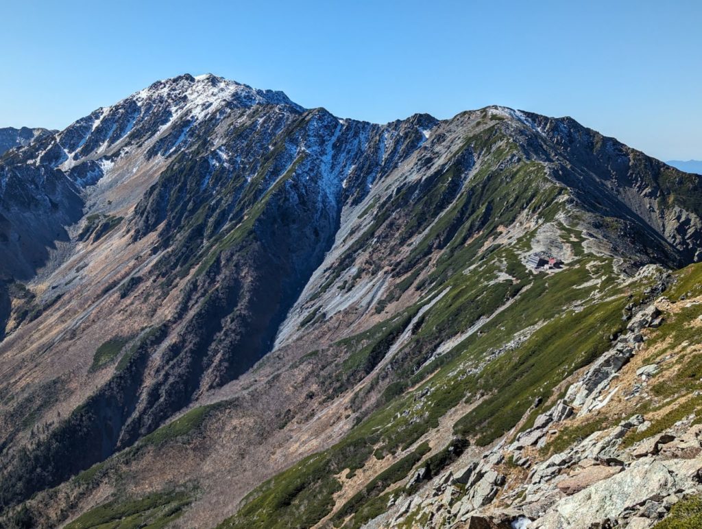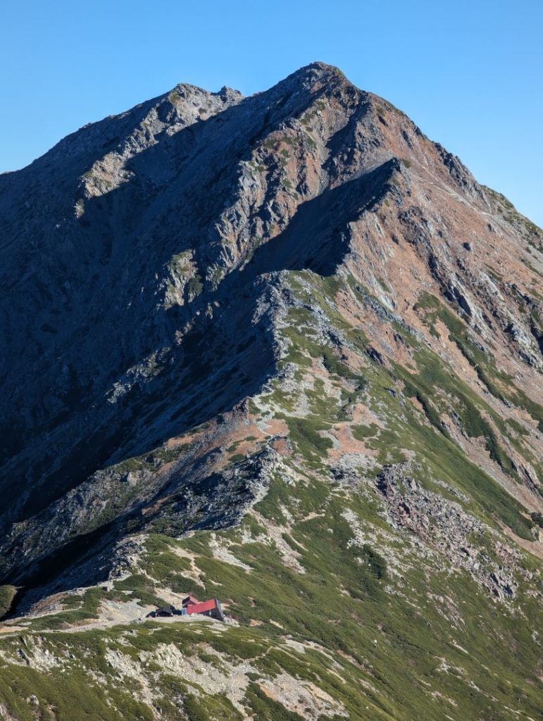 間ノ岳からの帰り道、目の前には雄大な北岳。遠くから山荘含めて望遠で捉えてみると山荘から見ていた姿とはまるで違って見えるのが不思議。