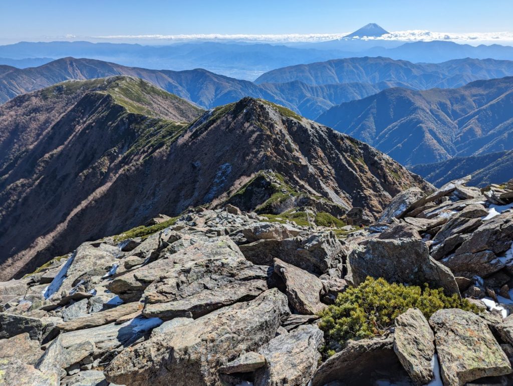 北岳山頂からの眺めは、仙丈ヶ岳、甲斐駒ヶ岳、富士山、間ノ岳などの山々の先にさらに北アルプスなども見通せて本当に素晴らしく、特に目を奪われたのは雪を冠った間ノ岳とそこに向かう稜線。ほんと嫌になるような登りがあっても登山をやめられないのは、息を呑むようなこういう景色が見られることと、確実に一歩を進めることで頂上に至ることが出来るってことだと改めて思う。