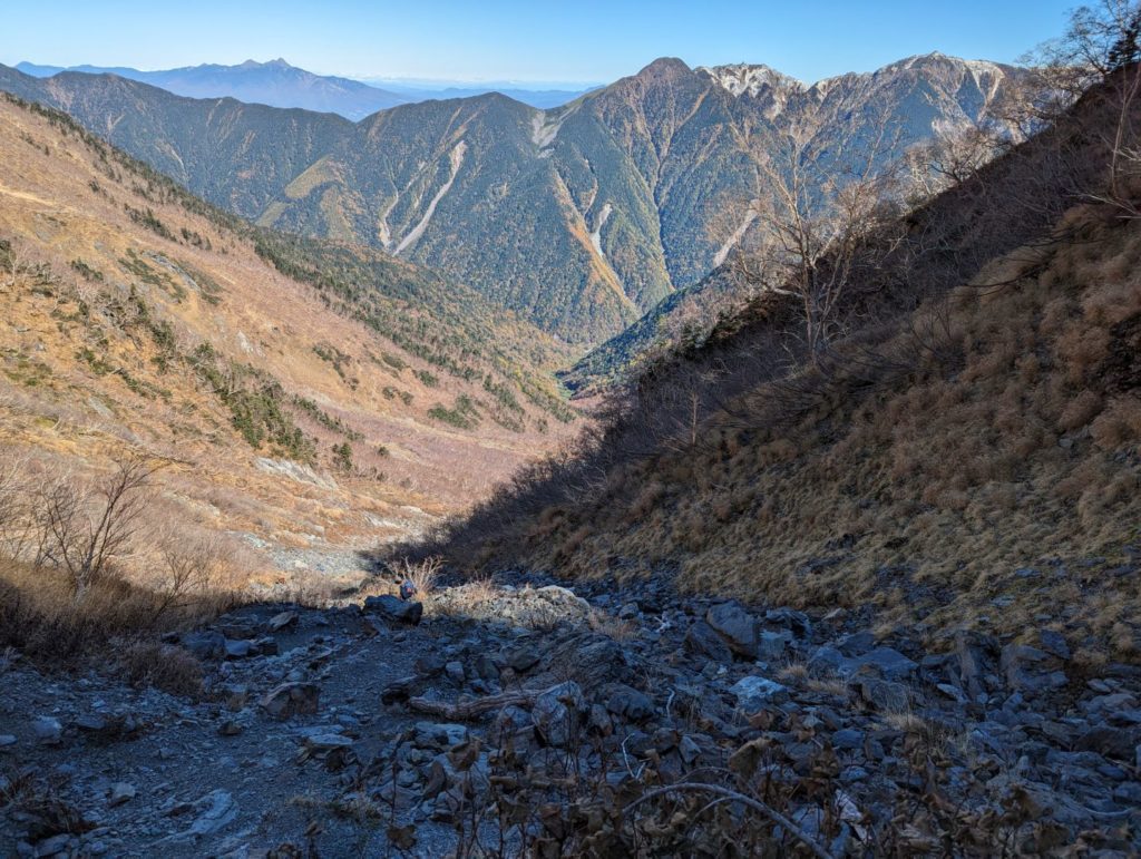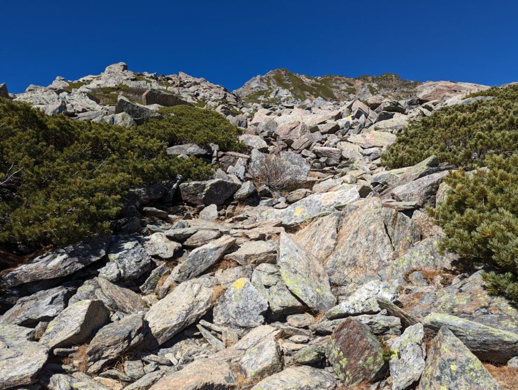八本歯のコルに向かう途中で少し苦戦をしたのが、大きな岩がゴロゴロした場所。斜度がそれなりにある中で、大きな岩がゴロゴロしていて、先が見えにくくどのルートというか岩を選んで進むのかちょっと迷うところがちらほら。ストックをしまって両手も使いながら降りていく。