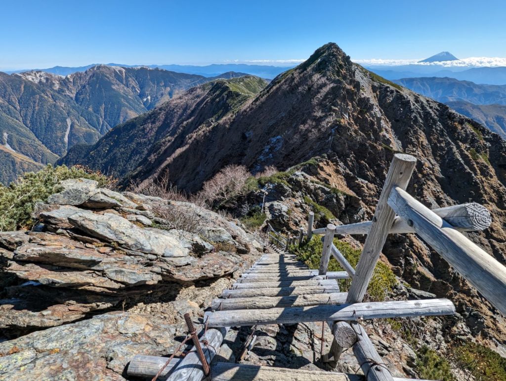 八本歯のコルからの下りには、雪がついて凍った路面だけでなく、ひたすらの梯子が続く難所でもあり、持ってきた12本のアイゼンをつけては梯子が辛すぎるため、外してはみたものの、梯子と梯子の間のちょっとした登山道は凍りついていて滑りやすく想定以上に苦戦。というわけで、写真を撮る余裕もほとんどなく。