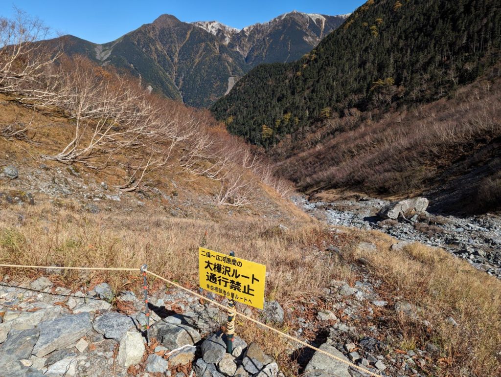 実は当初の予定では、このルートを通らず北岳山荘から北岳山頂に戻る形で行きと全く同じ道をピストンするつもりでした。その理由が、この大樺沢ルートが通行禁止で結果としてこちらのルートはすべて使えないものと思い込んでいたためでした。そうでは無いことがわかったので、行きとは違うルートを選んだわけですが、この大樺沢ルートが通れれば広河原までも更に短い時間で行けたのにとちょっと残念。