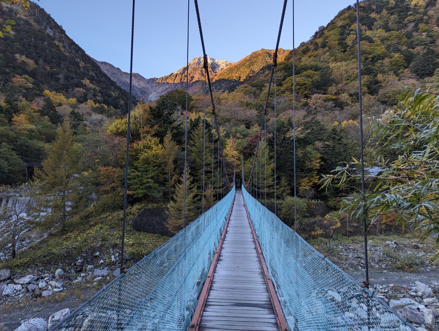 芦安温泉をバスで出た時はまだ真っ暗だったけど、1時間ほど山道を進んで広河原に到着する頃にはいい感じに明るくなっていた。荷物の確認をし、きりっと涼しい空気の中を歩き始めると、登山口の吊り橋がすぐに見えてくる、これから山に入って行く感じがあって良い感じ。ここから白根御池までは、樹林帯の中を3時間ほどの急登。