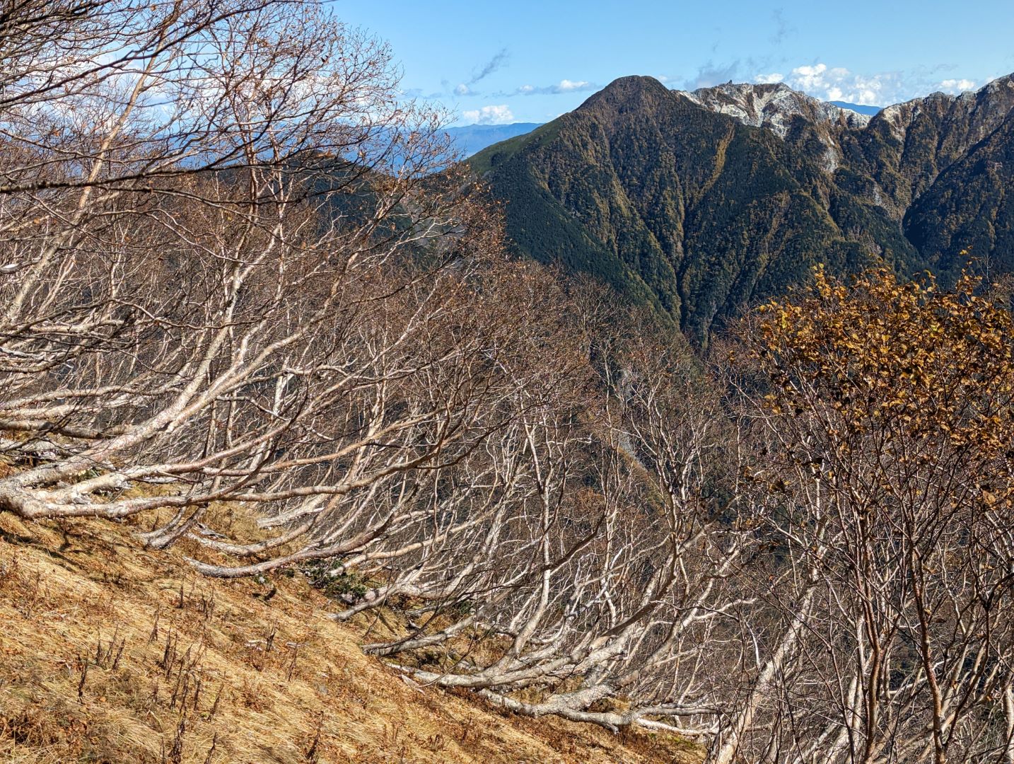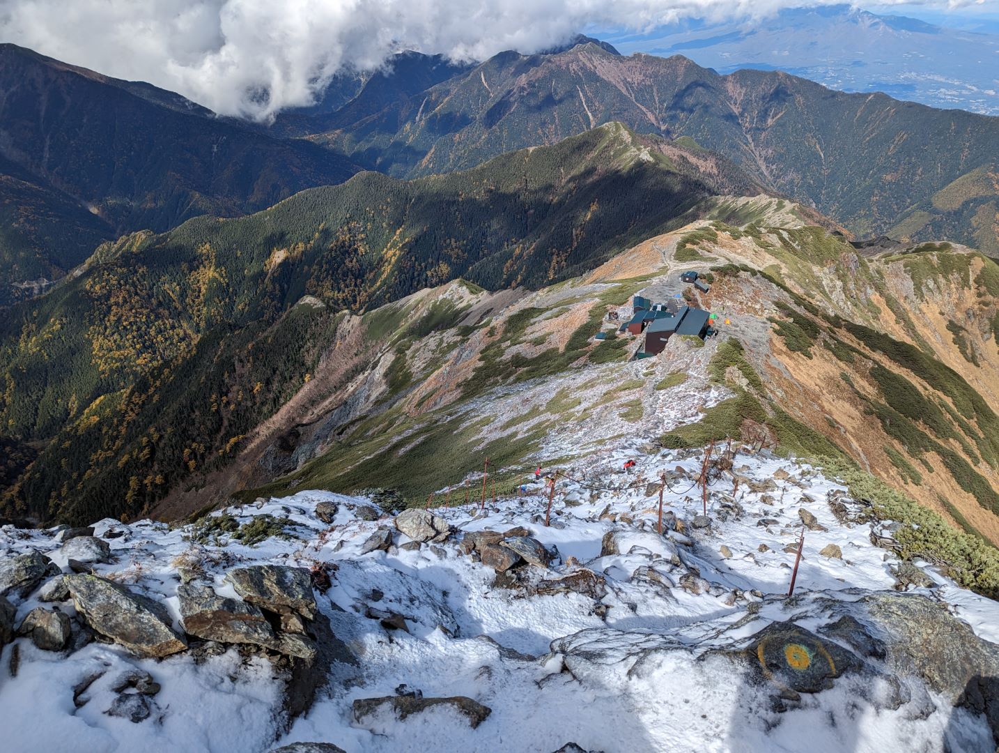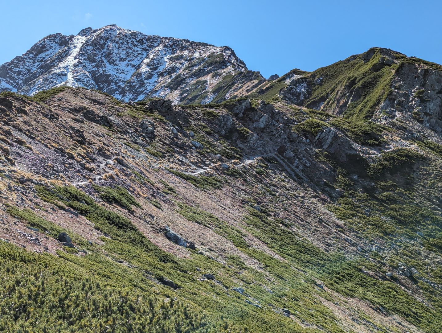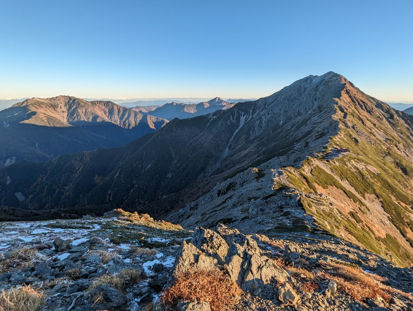 やっと稜線に!360度見回すと南アルプスの山々が広がり、これまでの急登の疲れが吹き飛ぶ。雪化粧した岩峰、紅葉の黄色、ハイマツなどの緑が錦のように美しく、この時期ならではの景色に思わず綺麗だなあと独り言が出てしまう。