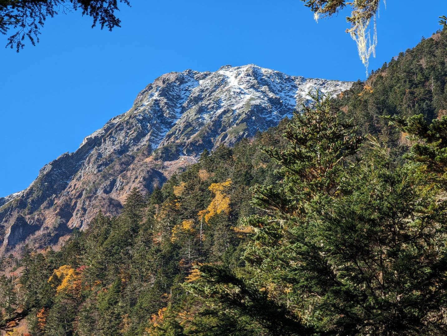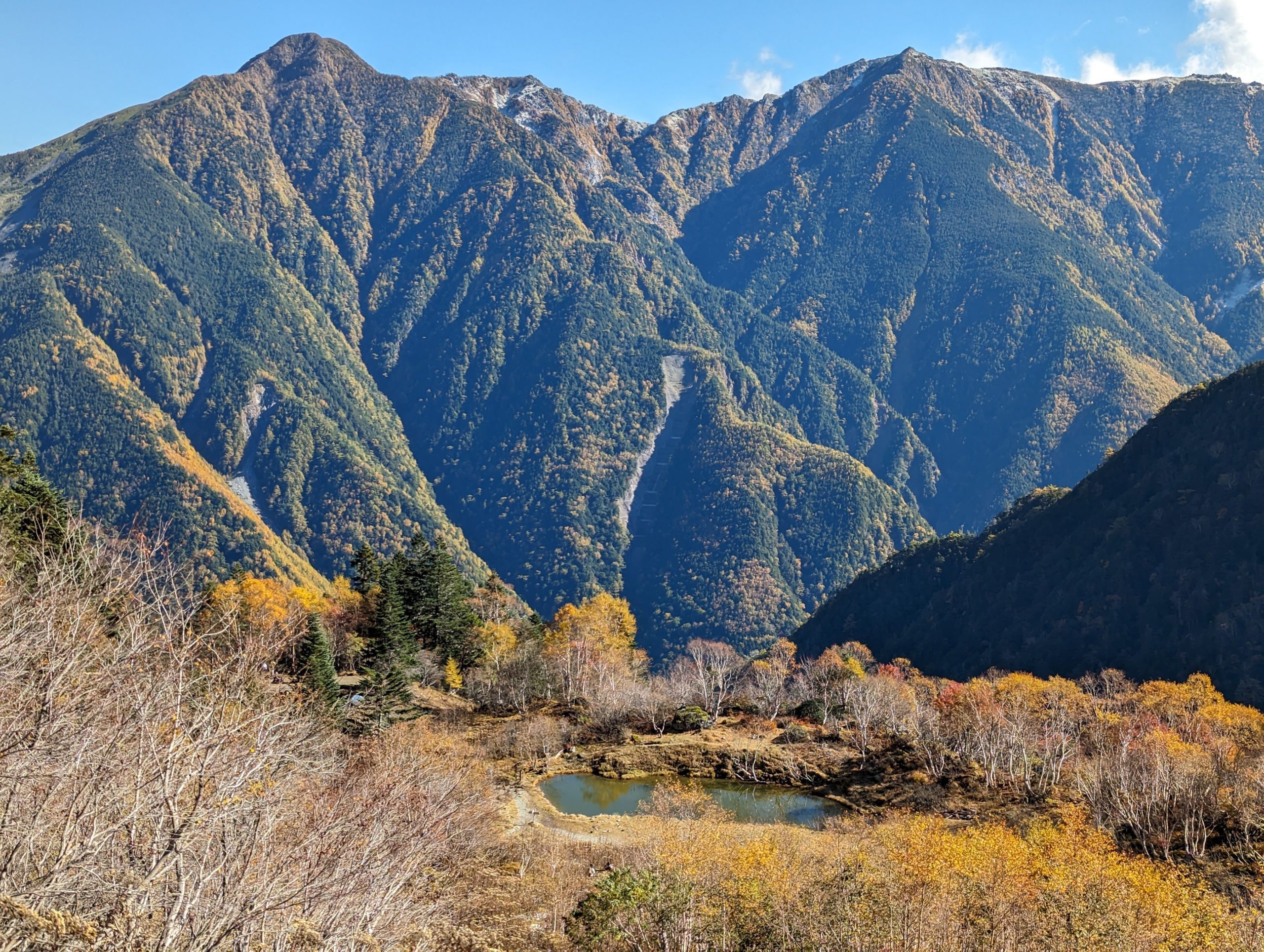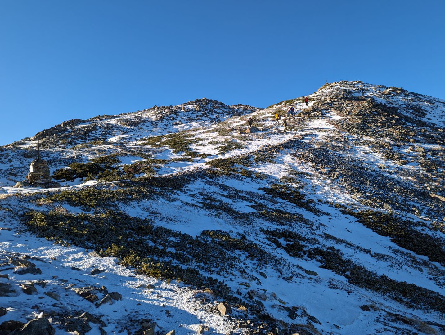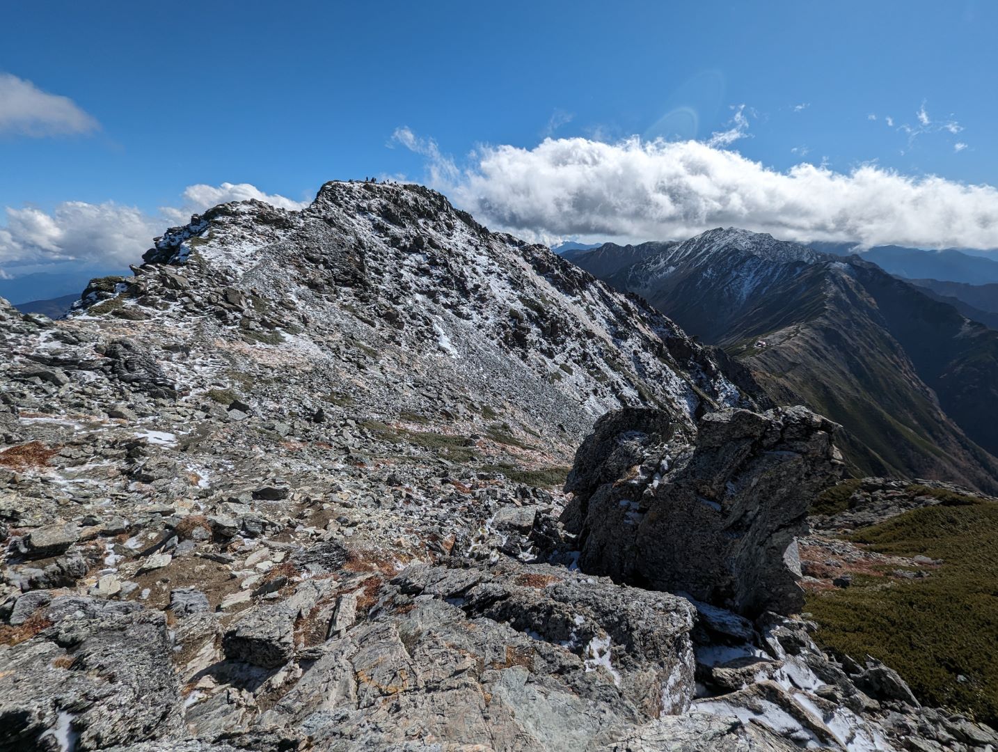 やっと稜線に!360度見回すと南アルプスの山々が広がり、これまでの急登の疲れが吹き飛ぶ。雪化粧した岩峰、紅葉の黄色、ハイマツなどの緑が錦のように美しく、この時期ならではの景色に思わず綺麗だなあと独り言が出てしまう。