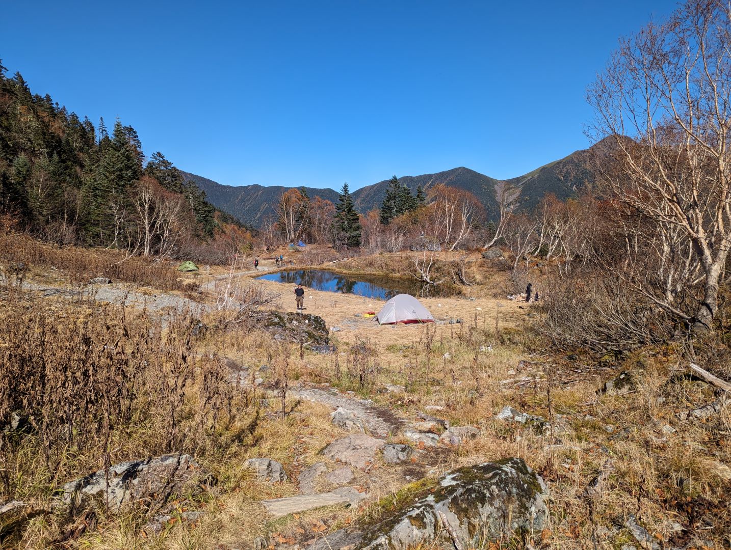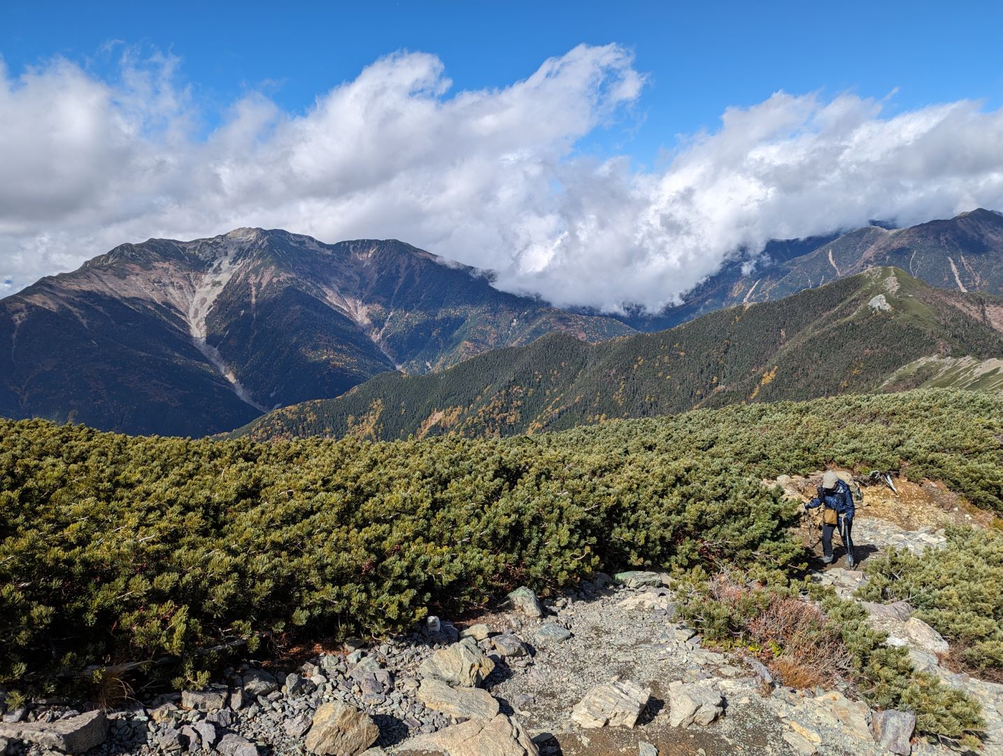 心配した天気にも恵まれて、鳳凰三山の地蔵岳のオベリスクもはっきり見える。おそらく初夏の頃は、このあたりの道はお花畑になっていて美しいのだろうけど、残念ながらこの時期はそれは無し。