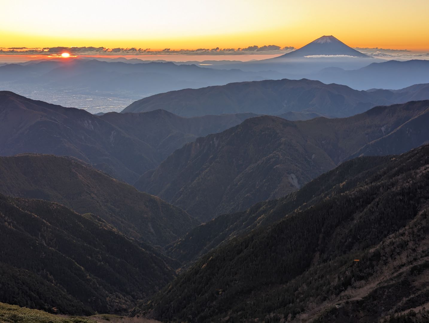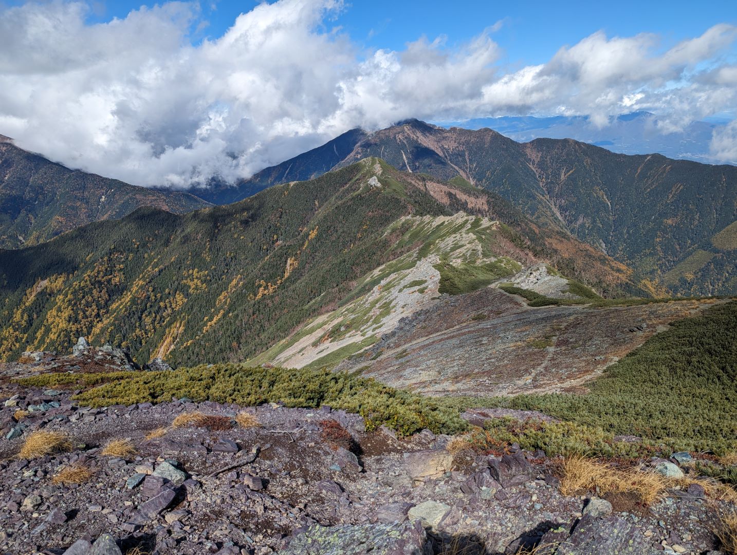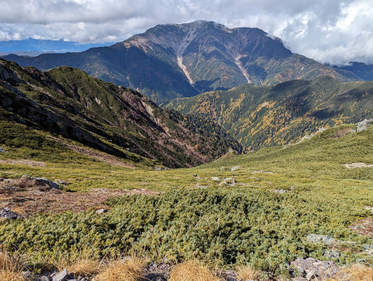 草すべりを登り振り返ると、眼下には黄色・金色に紅葉した木々や草花が広がり、その向こうにはどっしりと鳳凰三山が見える素晴らしい景色。これまでの急登を頑張ったご褒美って感じ。