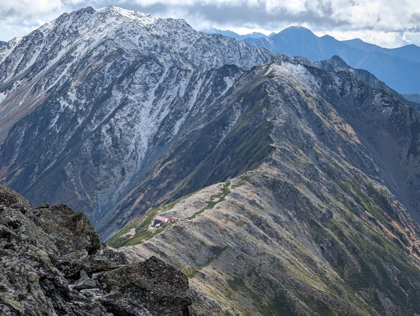 間ノ岳からの帰り道、目の前には雄大な北岳。遠くから山荘含めて望遠で捉えてみると山荘から見ていた姿とはまるで違って見えるのが不思議。