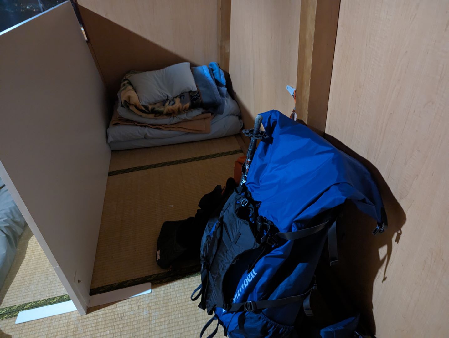 農鳥の部屋は、5名程度が泊まれるようになっていて、コロナ対策だと思うけれど板の仕切りがあるのはありがたい。掛け布団が少し小さくて足が出て寒かった。