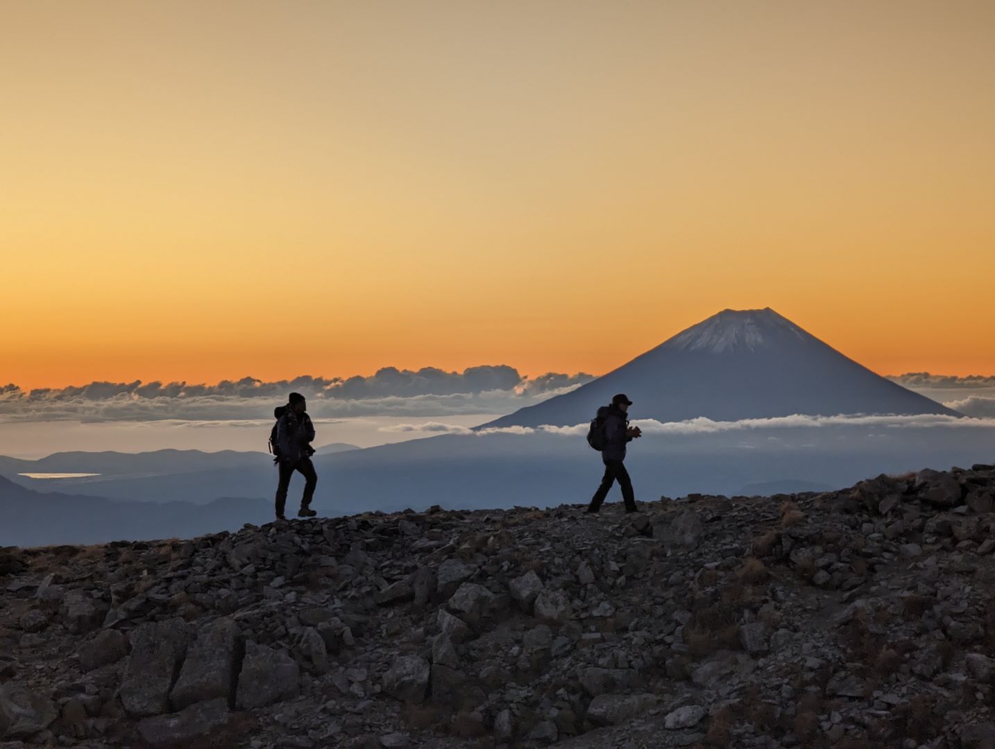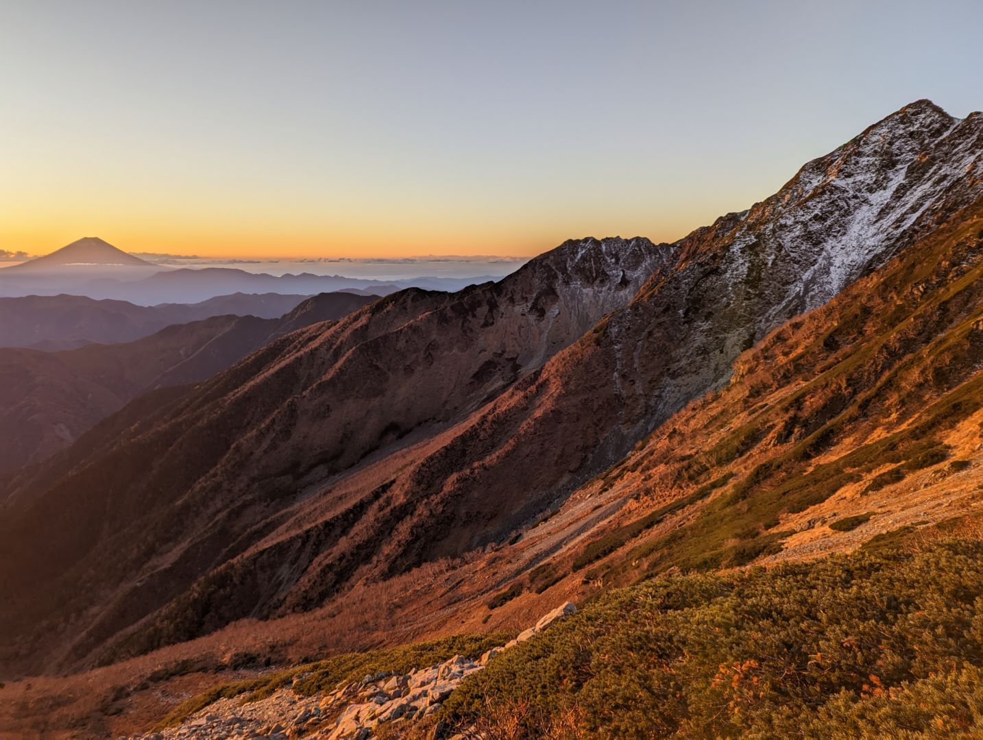 朝5:00 の朝食を終えて、外に出るとちょうど日の出の時間。北岳山荘の玄関裏側には目の前に朝焼けの空にくっきりとした富士山が。朝日を受けて赤く染まる姿が本当に綺麗。左に目を向けると美しい山容を見せる北岳がオレンジ色のグラデーションをした空に堂々とそびえていて、さらに西側に目を映すと、今度はピンク色の得も言われぬ色をした空に仙丈ヶ岳、さらに南側に目を向けるとモルゲンルートに染まる間ノ岳…贅沢な時間、まさに息を飲む絶景でした。