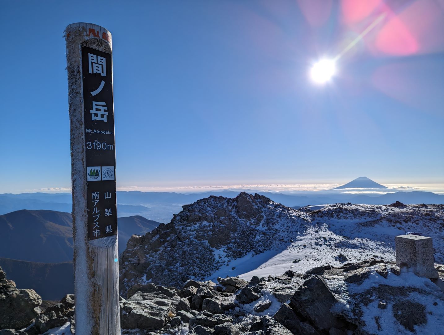 岩場に薄っすらと雪が積もっている状況を12本爪のアイゼンでとなったので、だいぶ気を使う登りではあったけど、なんとか北岳山頂に到着。いや…ここまで大変だとは思いもしなかったというのが正直なところ。