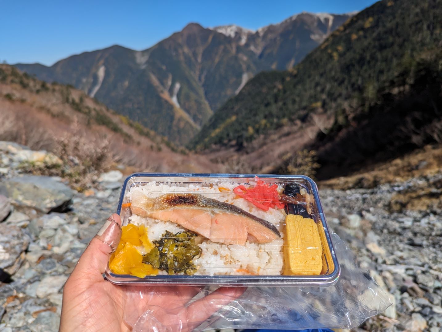 難所を越えてやっと一息できる場所を見つけてお弁当。たくさん食べる人を想定してなのか、すし飯がギュウギュウ詰めになってるのにはちょっと笑った(食べきれなかった)けど、鳳凰三山を眺めながらの美味しくて贅沢なお昼ごはんでした。