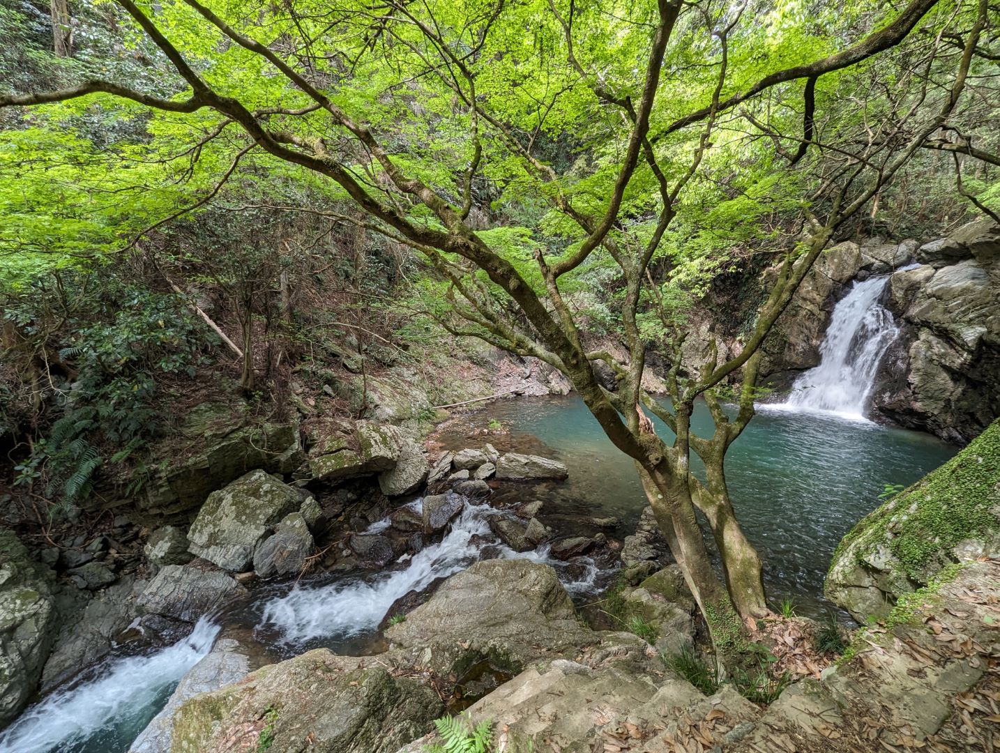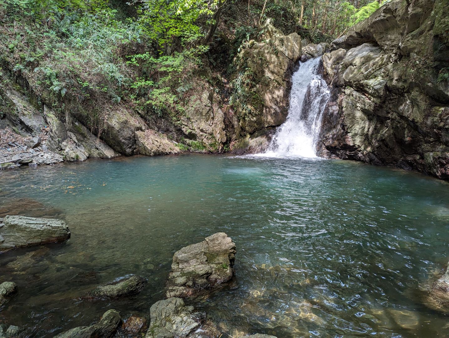 しばらく歩くと、美しい滝が目の前に。浜松市街からサイクリングで1時間弱でこんな風景に出会えるとはちょっとびっくり。この日はしばらく一人だけでのんびりと景色を堪能。一組の家族連れが滝つぼの下の流れの緩やかな場所で水遊びをしていたくらいで、人も少なくこの素晴らしい景色をわりといつでも静かに楽しめそうな場所。