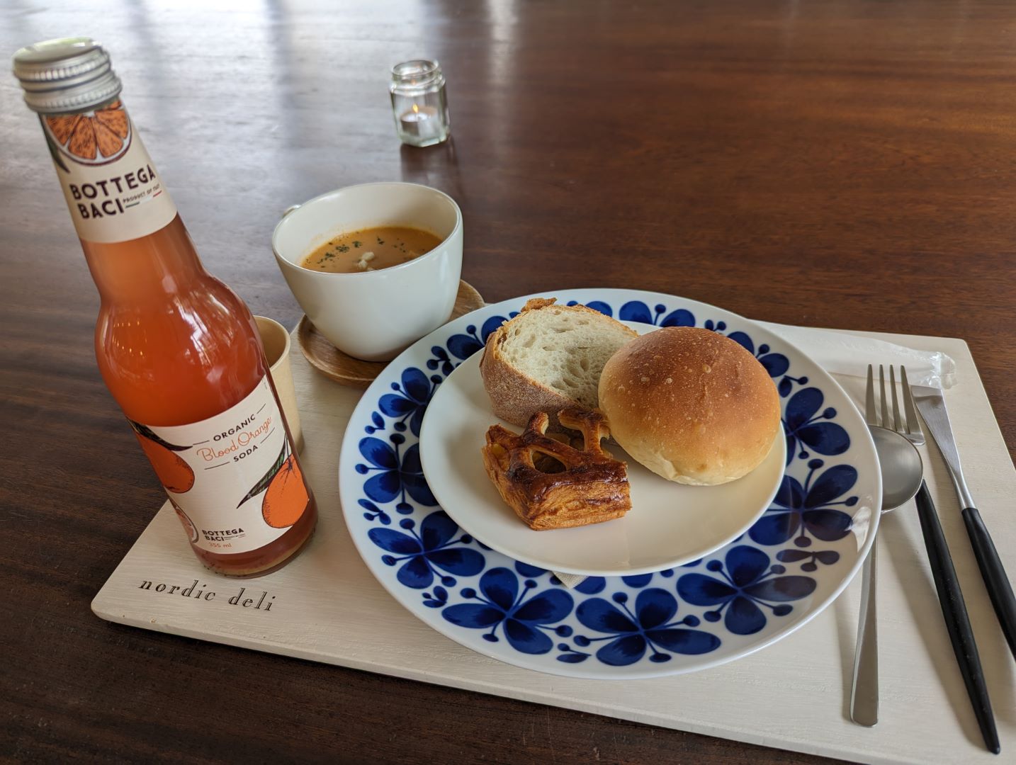 ドロフィーズカフェは、女性のグループやカップルだらけでとても入れる雰囲気ではなかったので、ノルディックデリで軽いランチ。海老のビスクスープと美味しそうなパンのセットと、微炭酸のブラッドオレンジジュースをあわせて注文。こんな洒落たランチは随分と久しぶり。