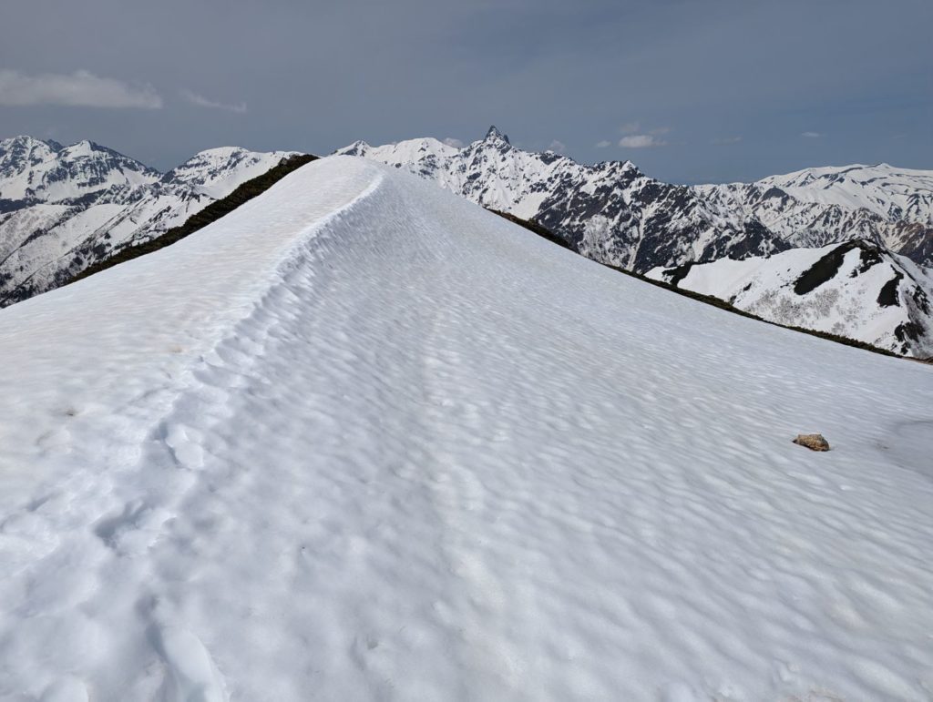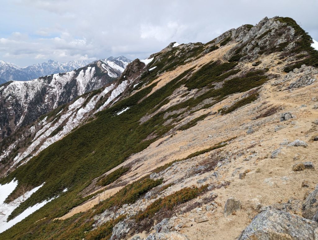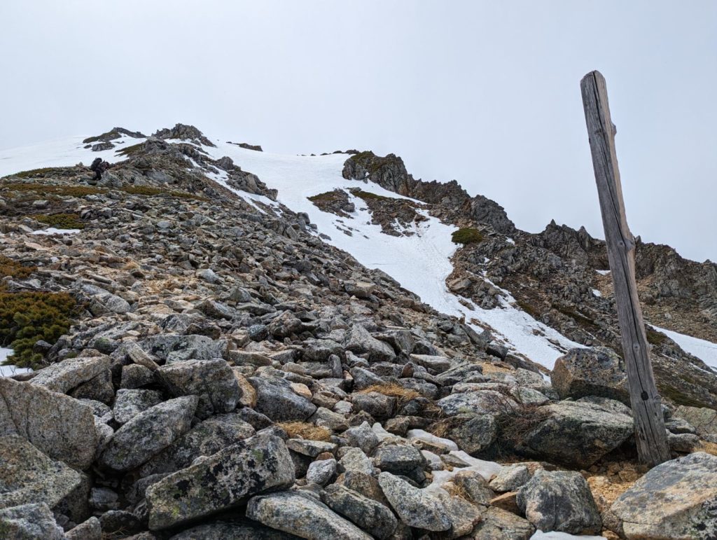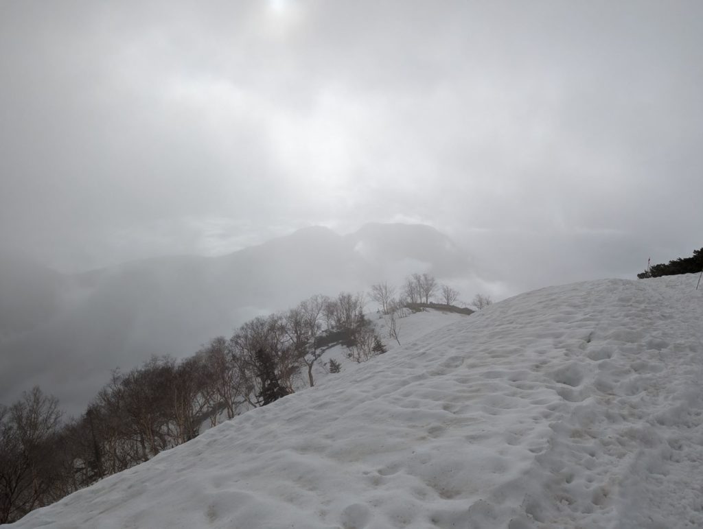 横通岳から先はだいぶ雪の量が増えてきて、アイゼンをつけるほどではないけど、チェーンスパイク欲しいなという感じの道が…アイゼンを持ってきたので、チェーンスパイクは荷物減らすために持ってこなかったのが痛い。
