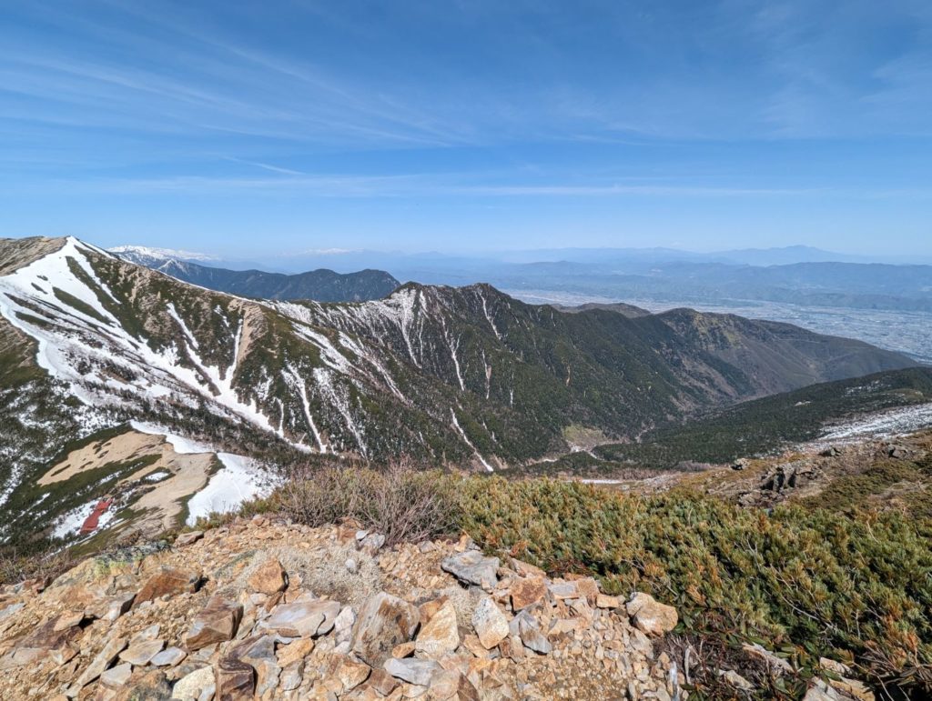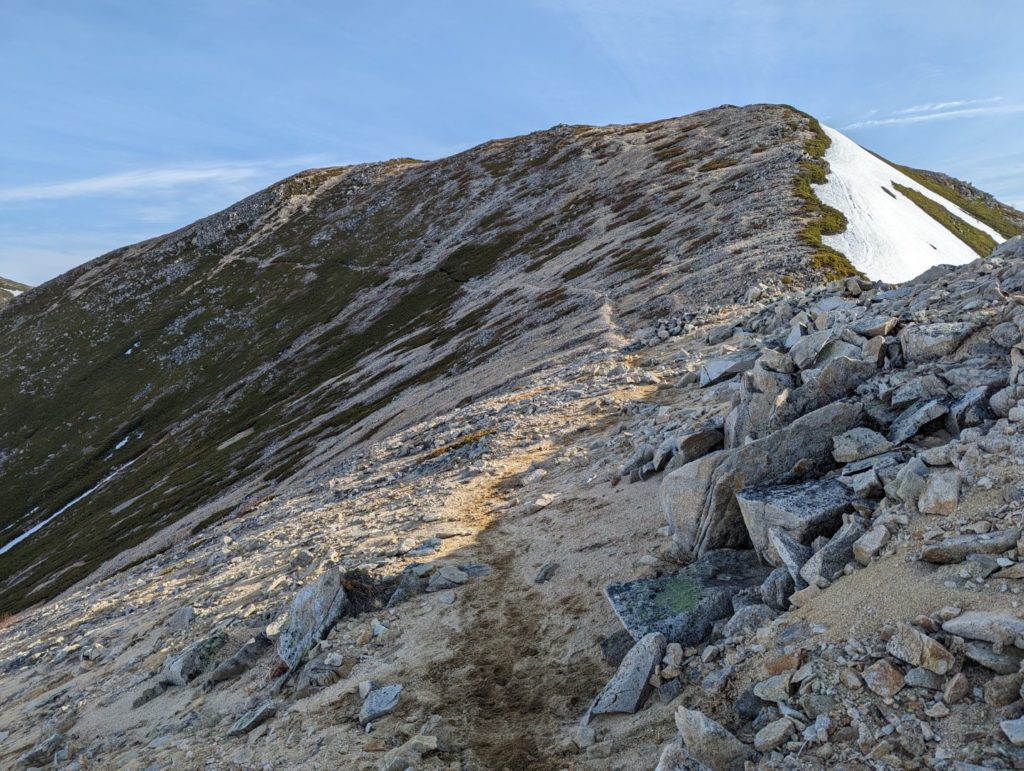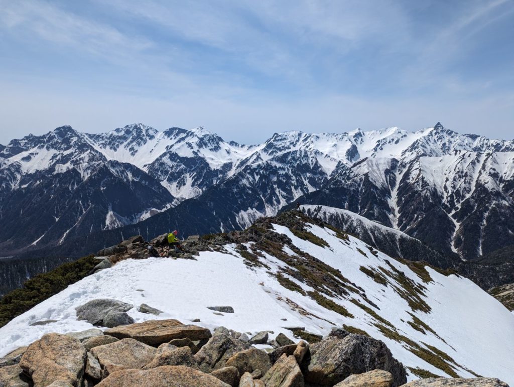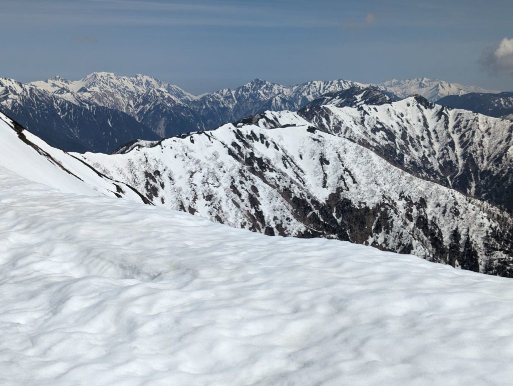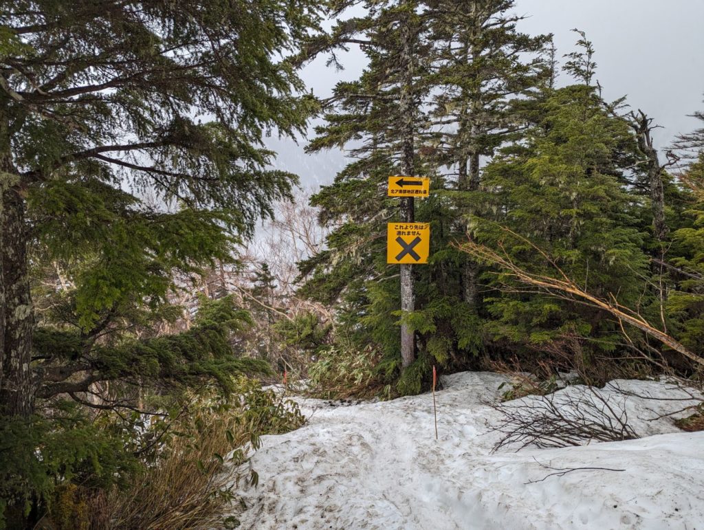 横通岳から先はだいぶ雪の量が増えてきて、アイゼンをつけるほどではないけど、チェーンスパイク欲しいなという感じの道が…アイゼンを持ってきたので、チェーンスパイクは荷物減らすために持ってこなかったのが痛い。
