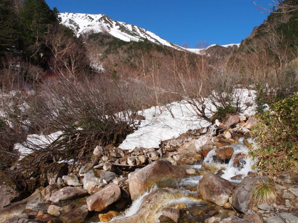 この時期の登山では、渡渉が必要な場所がいくつかあって、そこそこ流れも早い状態なので注意が必要。実際、年配の女性が足を取られて倒れそうになったのを目にしたりしたこともあり気が抜けない。