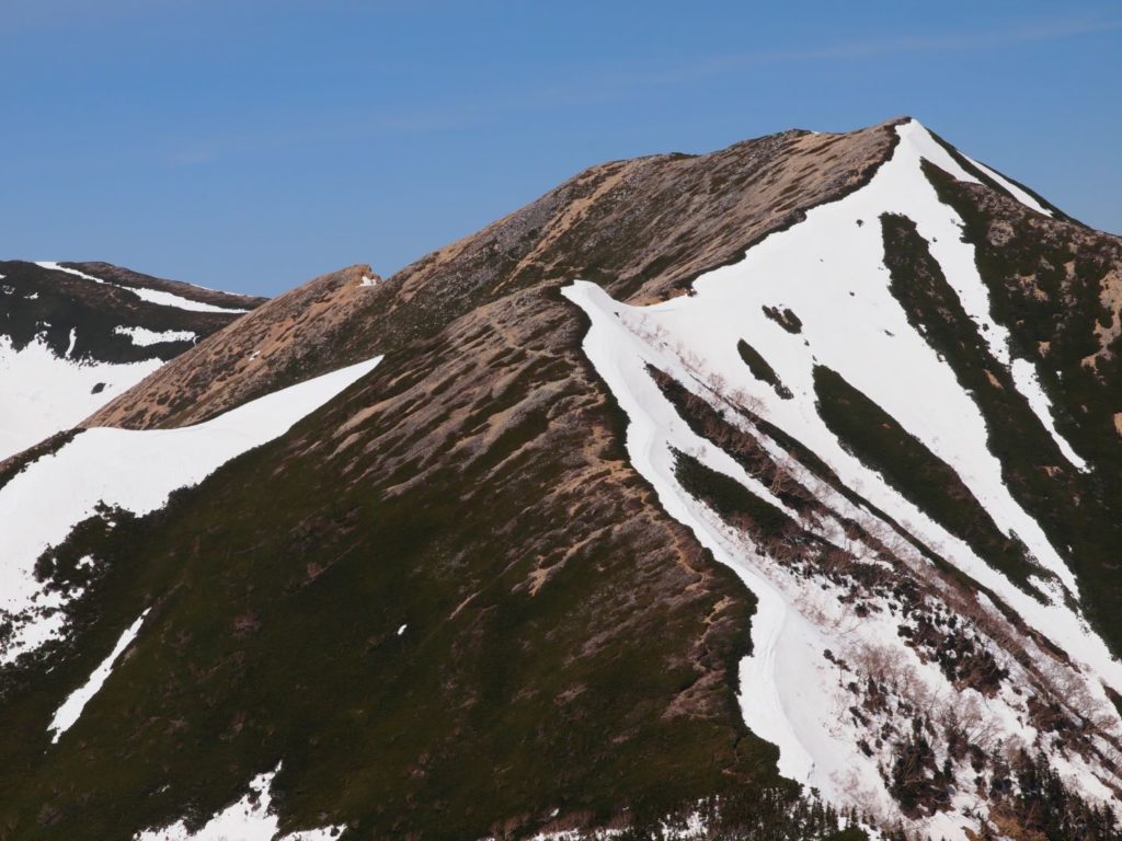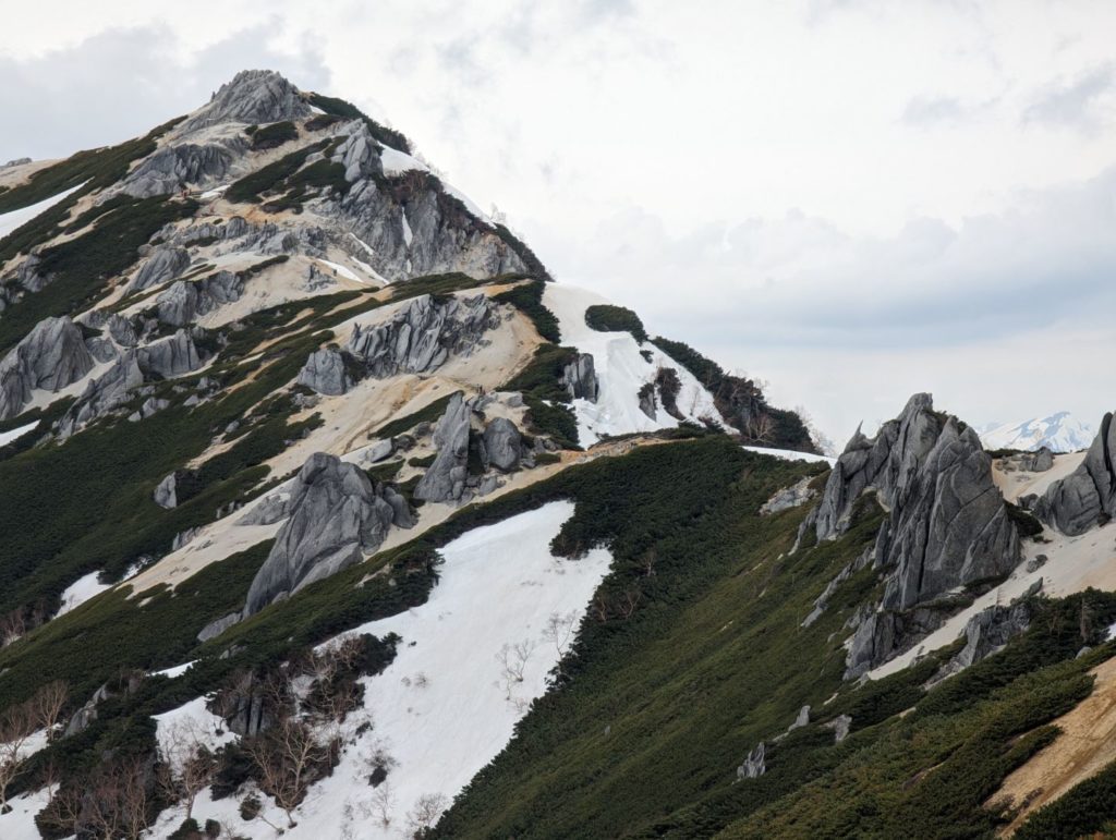 蛙岩も一体どうすればよいのかしばらく考え込んでしまった場所。実際、写真の真ん中の恐ろしく狭い空間を反対側から抜けてきたのだけれど、夏道は雪がなく滑落の心配もないので、これを通らず巻いて抜けるみたい。雪が残るこの時期は、この狭い穴を抜けるので荷物含めて大苦戦…