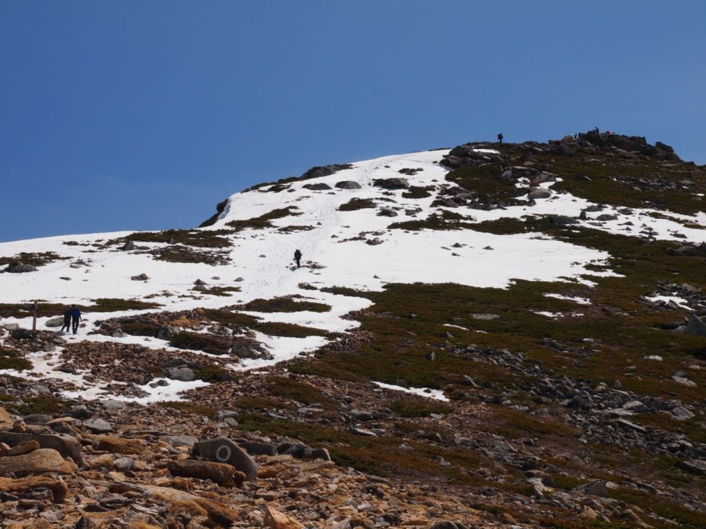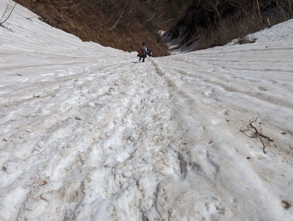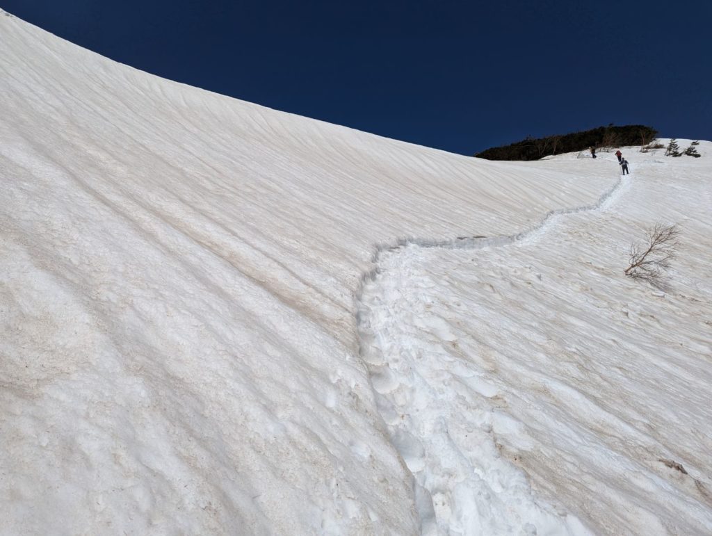 眼の前に随分と上の方まで続く雪渓が見えてきて、ここでアイゼンを装着。この晴天で雪はだいぶ緩んでいる上に急斜面ということもあって、アイゼンをしていてもズルズルと滑ってなかなか大変。