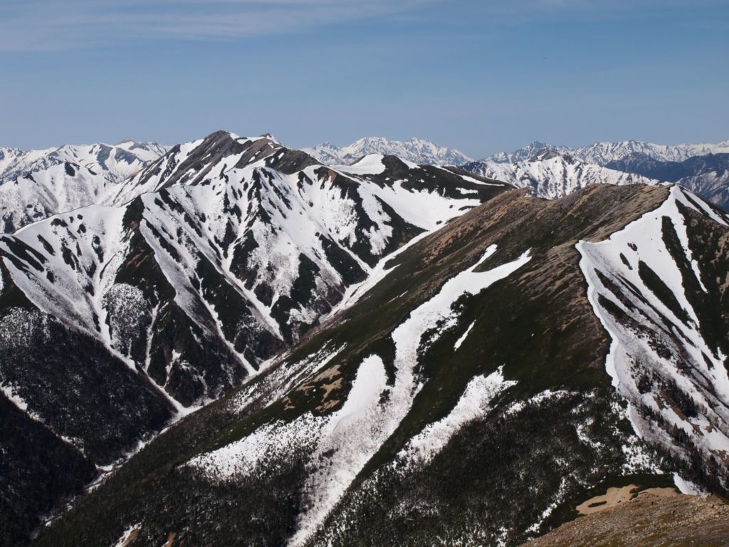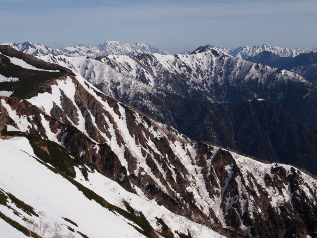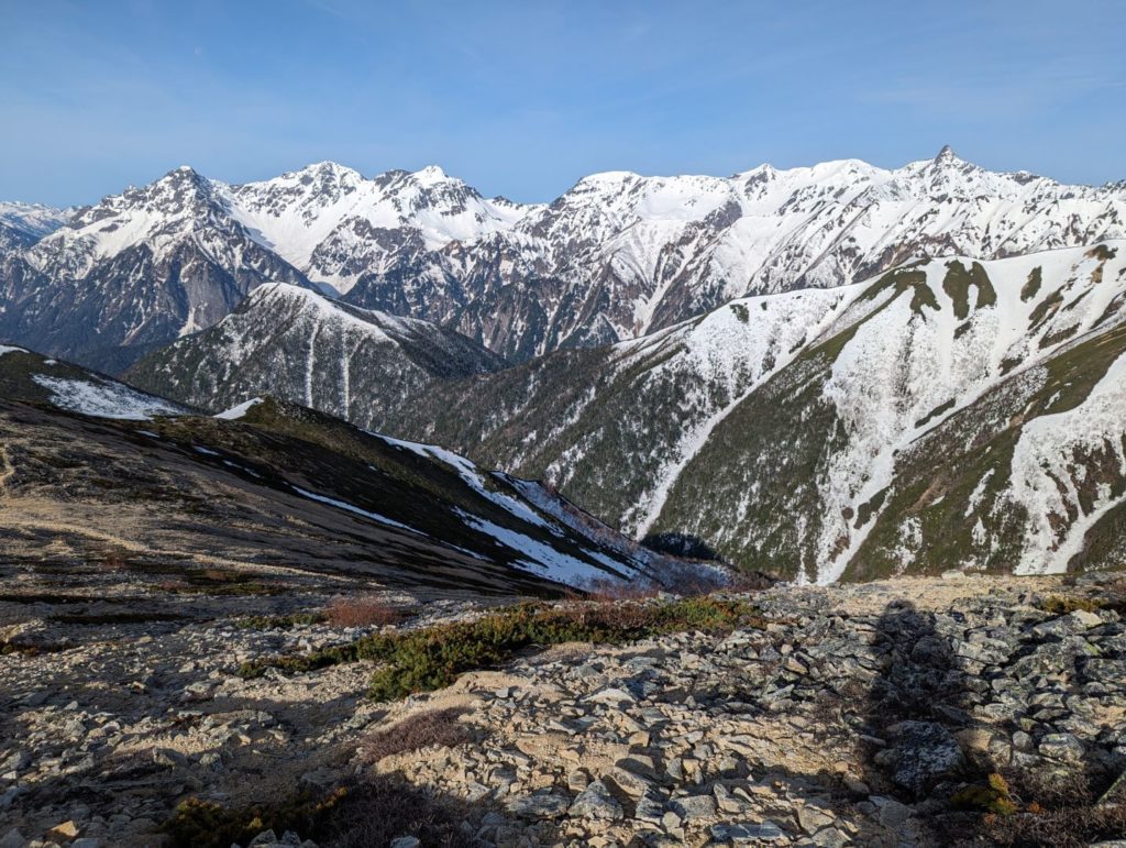 常念小屋から横通岳へのルートでは、左手に穂高連峰の山々が凄い迫力で見えていて、本当に目が離せない感じ。