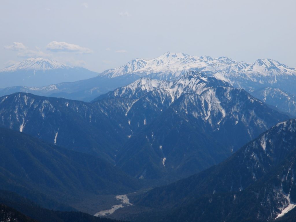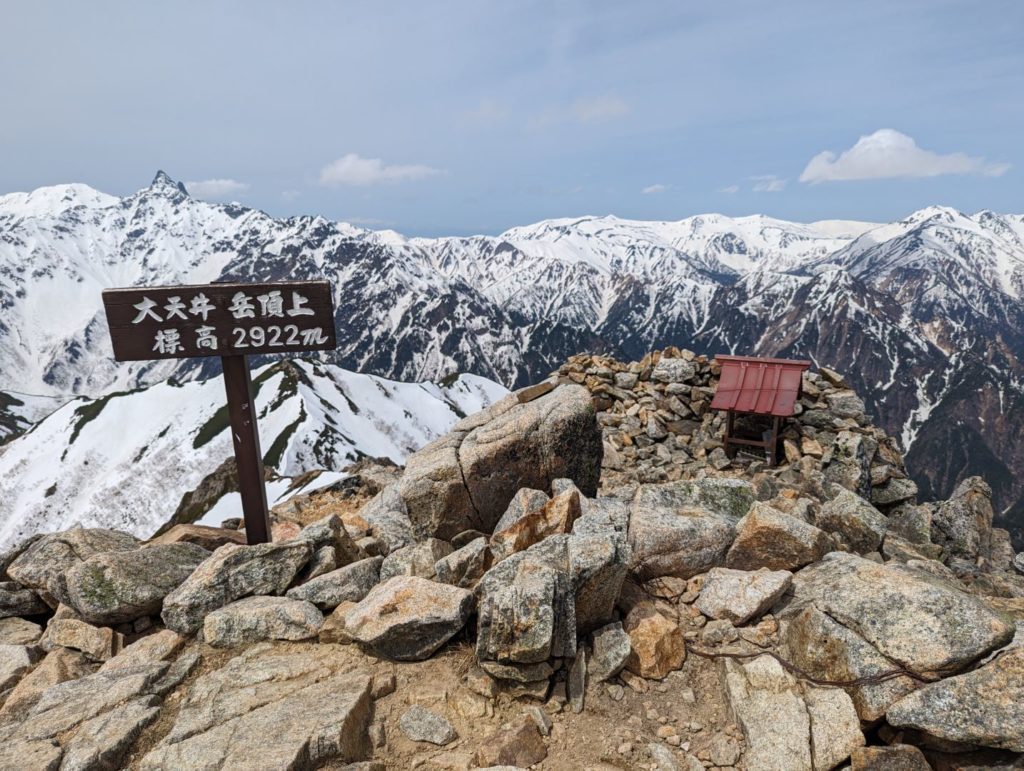 大天荘は実際かなりの部分がまだ雪に埋もれていて、そこから大天井岳への上りもかなりの積雪。やっとの思いで到着した大天井岳山頂からの眺めはやはり素晴らしく、誰もいない中で景色を独り占めして楽しみました。
