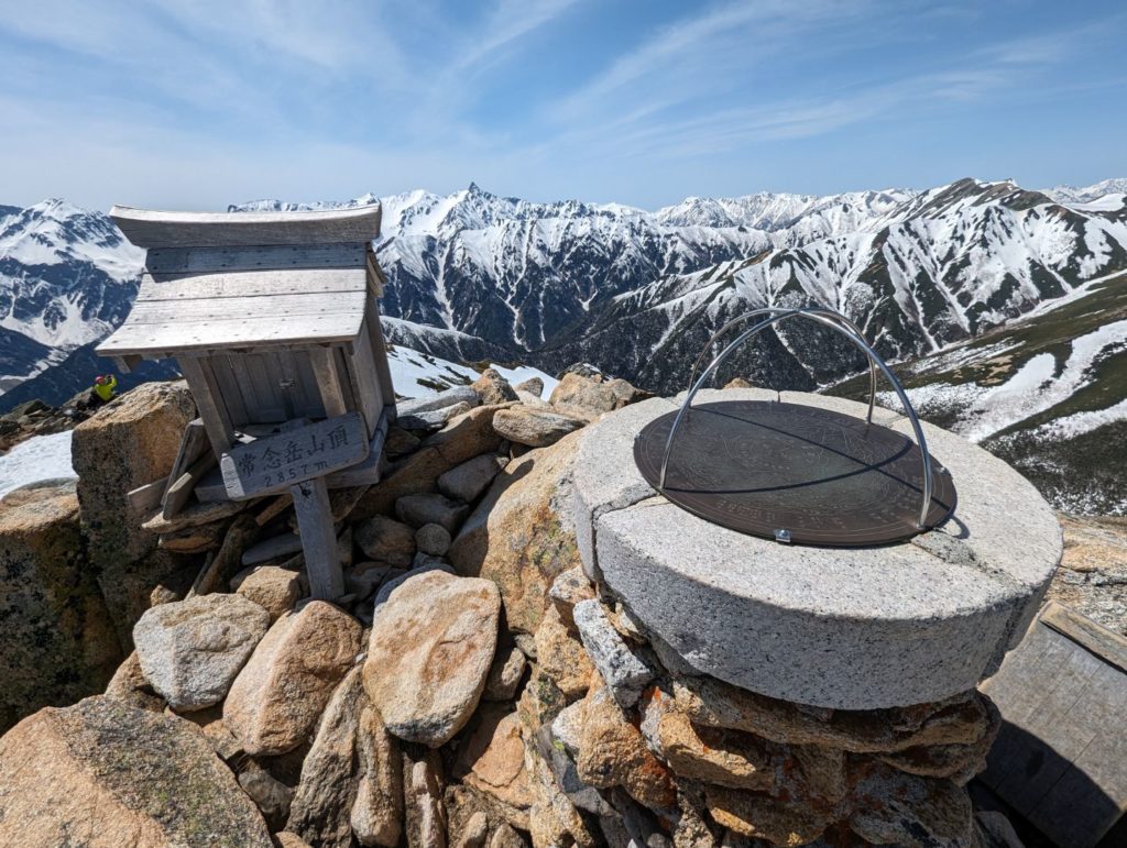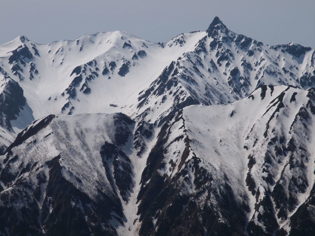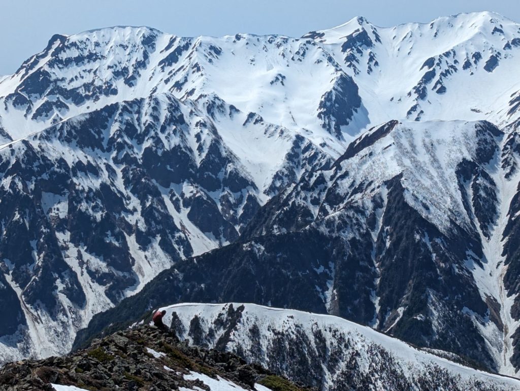 常念岳山頂からの 360度の大展望は、本当に忘れがたい素晴らしい景色で、北アルプスに何度も来たくなるという登山者が多いのもよく分かる。自分の場合は、真っ青な青空と真っ白な雪と、雪が被っていない黒い部分のコントラストの美しさに思わず何度もため息が出るほどで、しばし山頂の絶景を楽しんでいました。